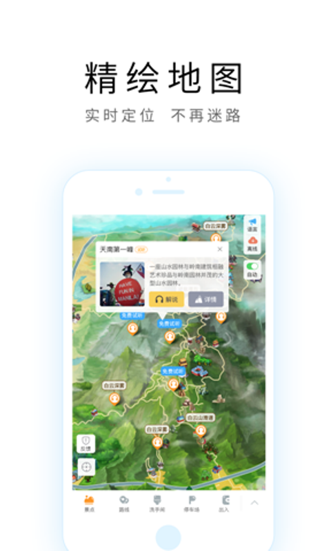 地图导航功能:为每个景区精心定制了手绘风格的地图,直观易懂的导航设计让您轻松找到目的地,再也不用担心在景区迷路。