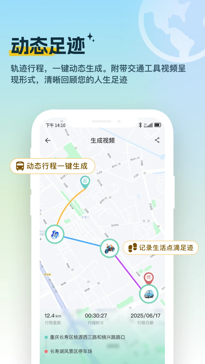 足迹记录与分享:自动生成个人出行地图,支持自定义壁纸和社交平台分享,让生活轨迹可视化。