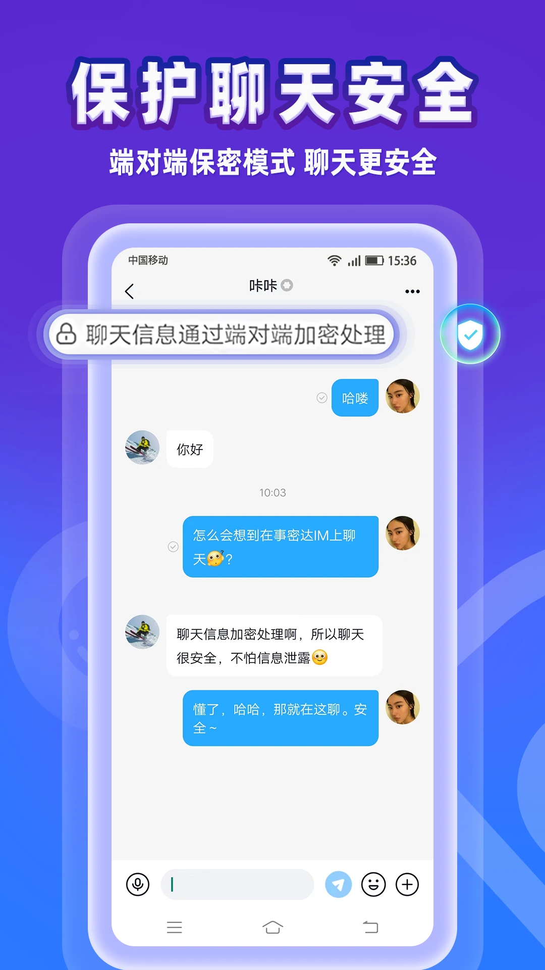 事密达IM,开启24小时端对端保密模式,一键保护,让聊天隐私牢牢掌握在自己手里,让聊天更轻松、更安全!-----主要功能-----