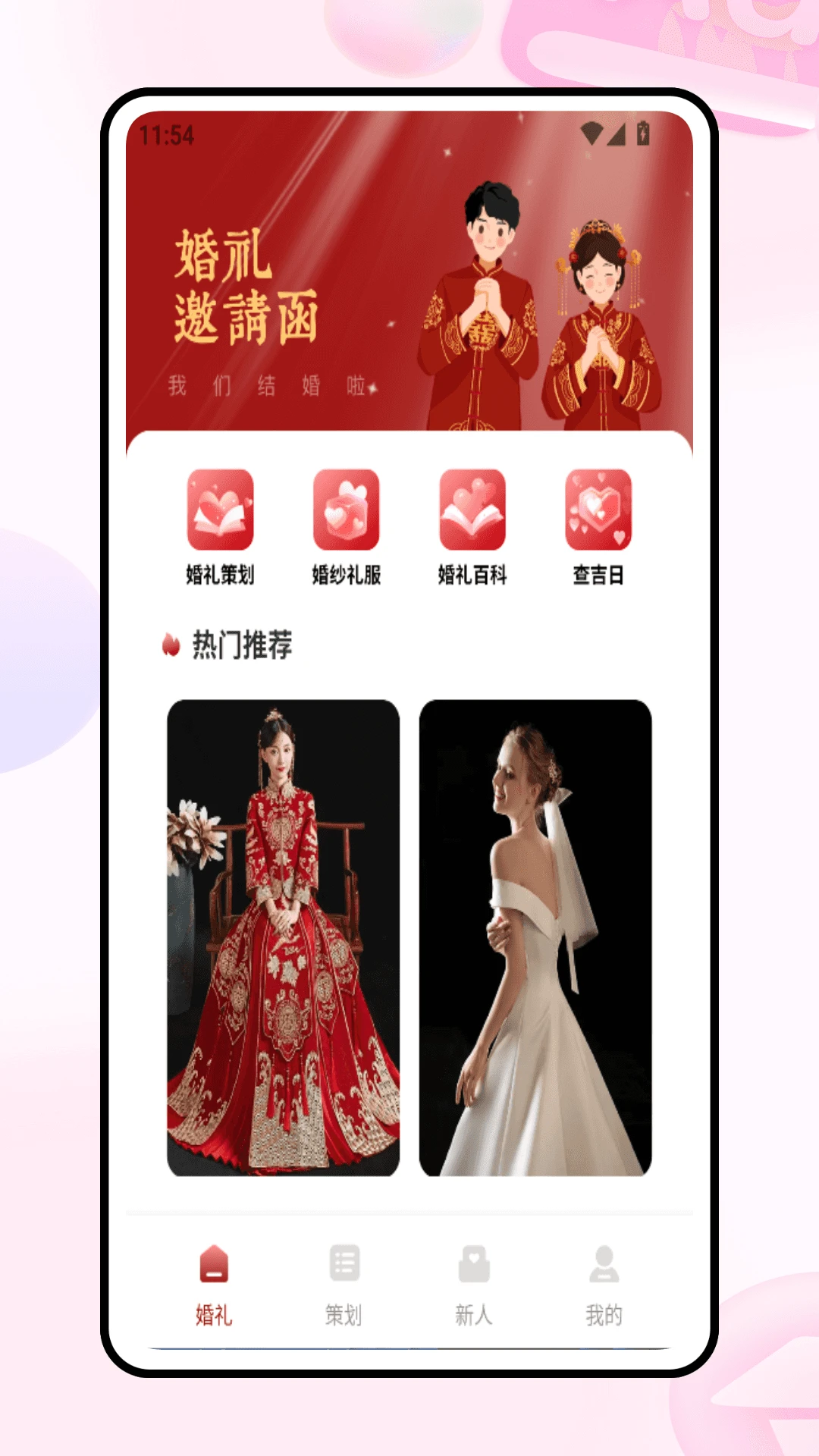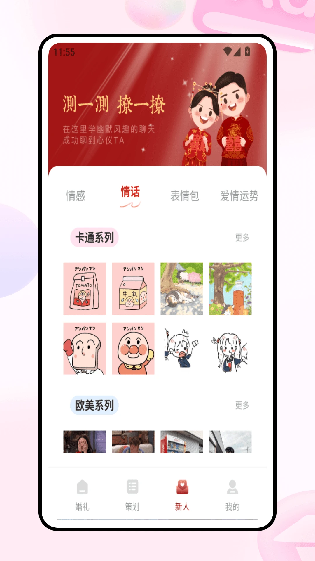 在婚礼页,从婚礼策划的创意构思,到礼服挑选的时尚指南,再到婚礼百科的各项知识,以及查吉日的贴心服务,助力打造满意婚礼。策划页提供细致入微的筹备方案,确保万无一失。新人页则是情感加油站,情感小贴士、浪漫情话、有趣表情包,还有爱情运势。