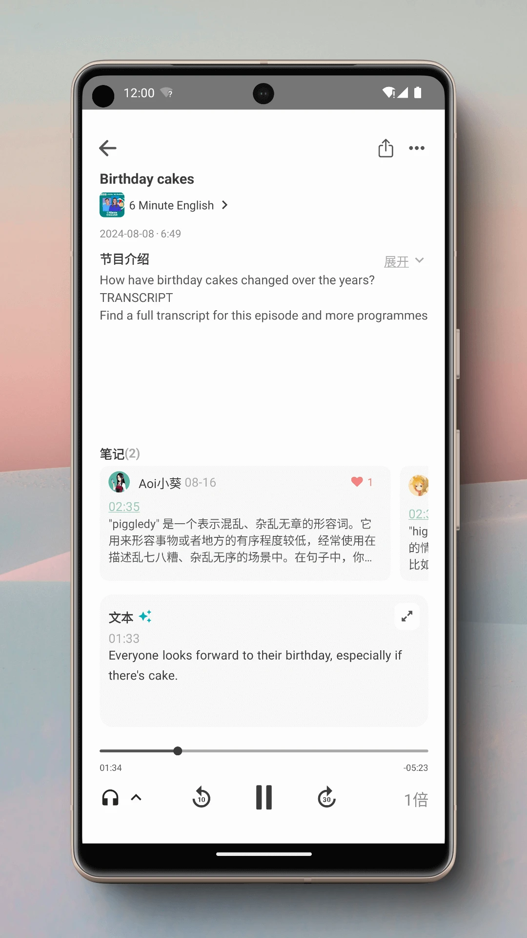 内置热门的英语、日语播客,支持字幕、翻译、点击查词,支持笔记、跟读等功能。