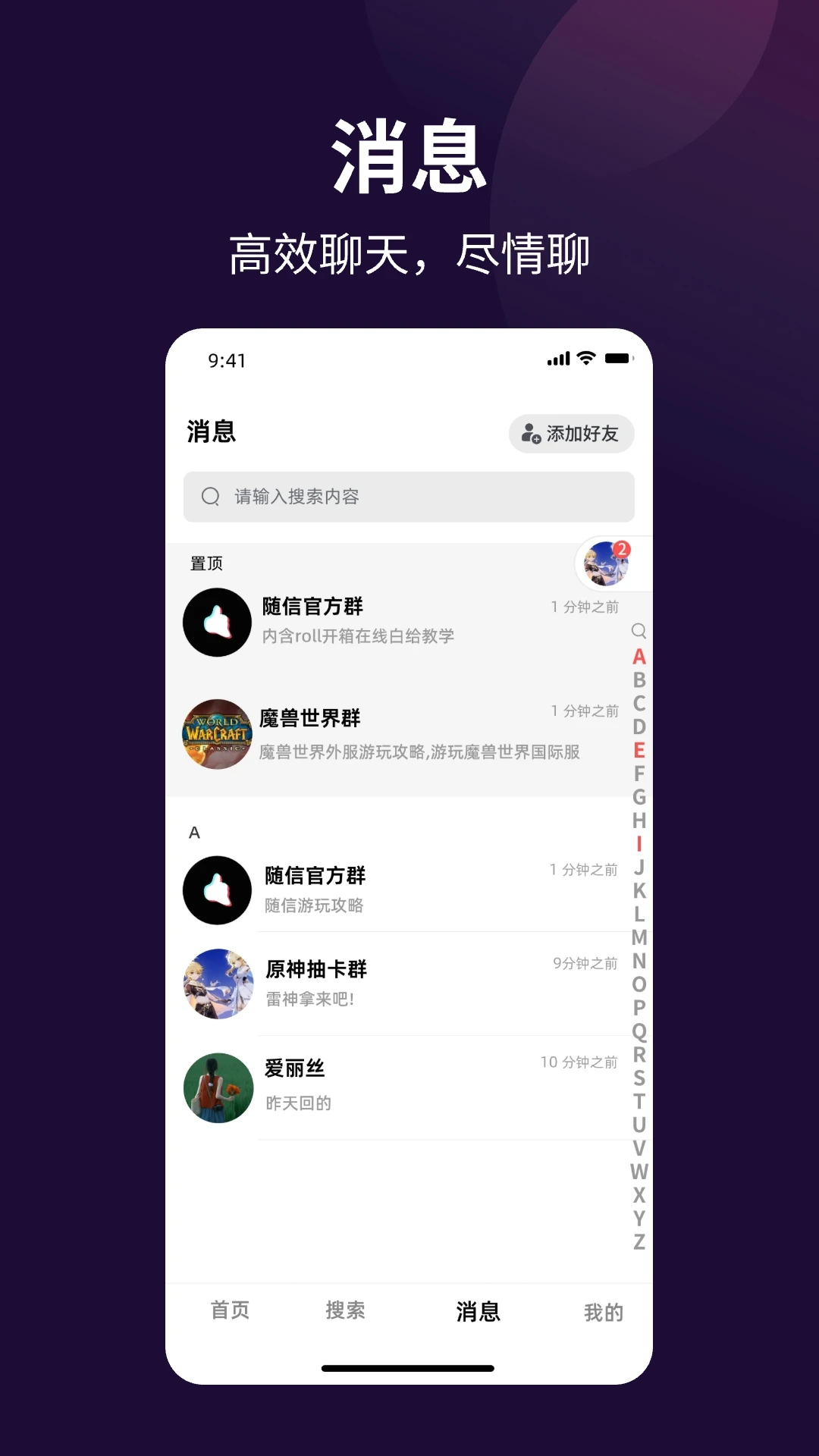 随信是一款无须添加好友的通讯社交产品。解决聊天过程聊天内容泄漏问题,好友可以无压力交流沟通。这里聊的才是放心聊的,随时随地与人放心聊。为什么要使用随信?随信主打功能:任何用户无法截图录屏录音聊天内容,主打一个轻松畅聊无须担心对方截图聊天记录认识新朋友:随信打通各大热门社交帐号,让你的社交帐号也能作为您的唯一数字名片ID