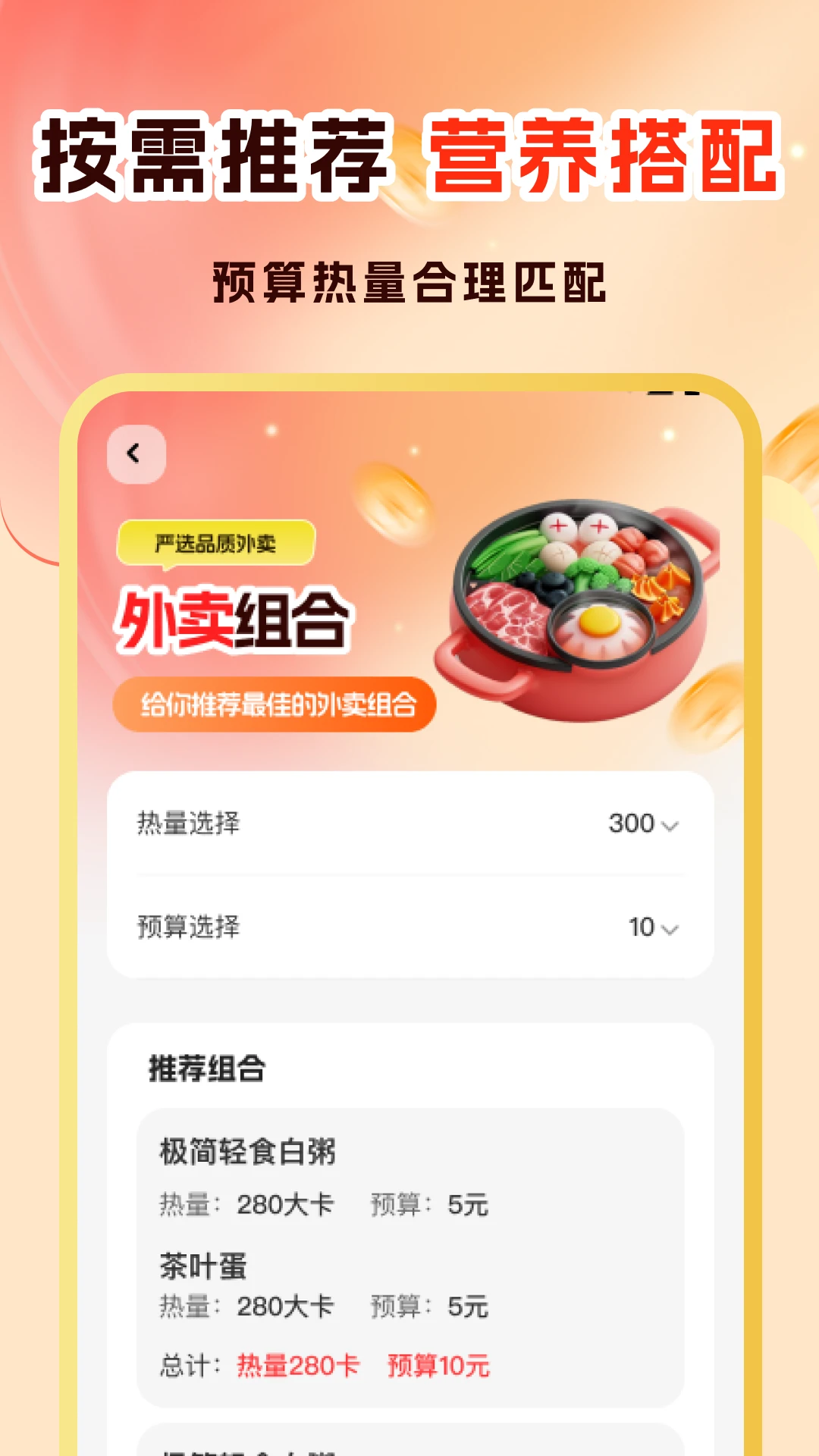 外卖组合推荐:根据用户预算和热量需求,智能匹配最佳餐品组合。