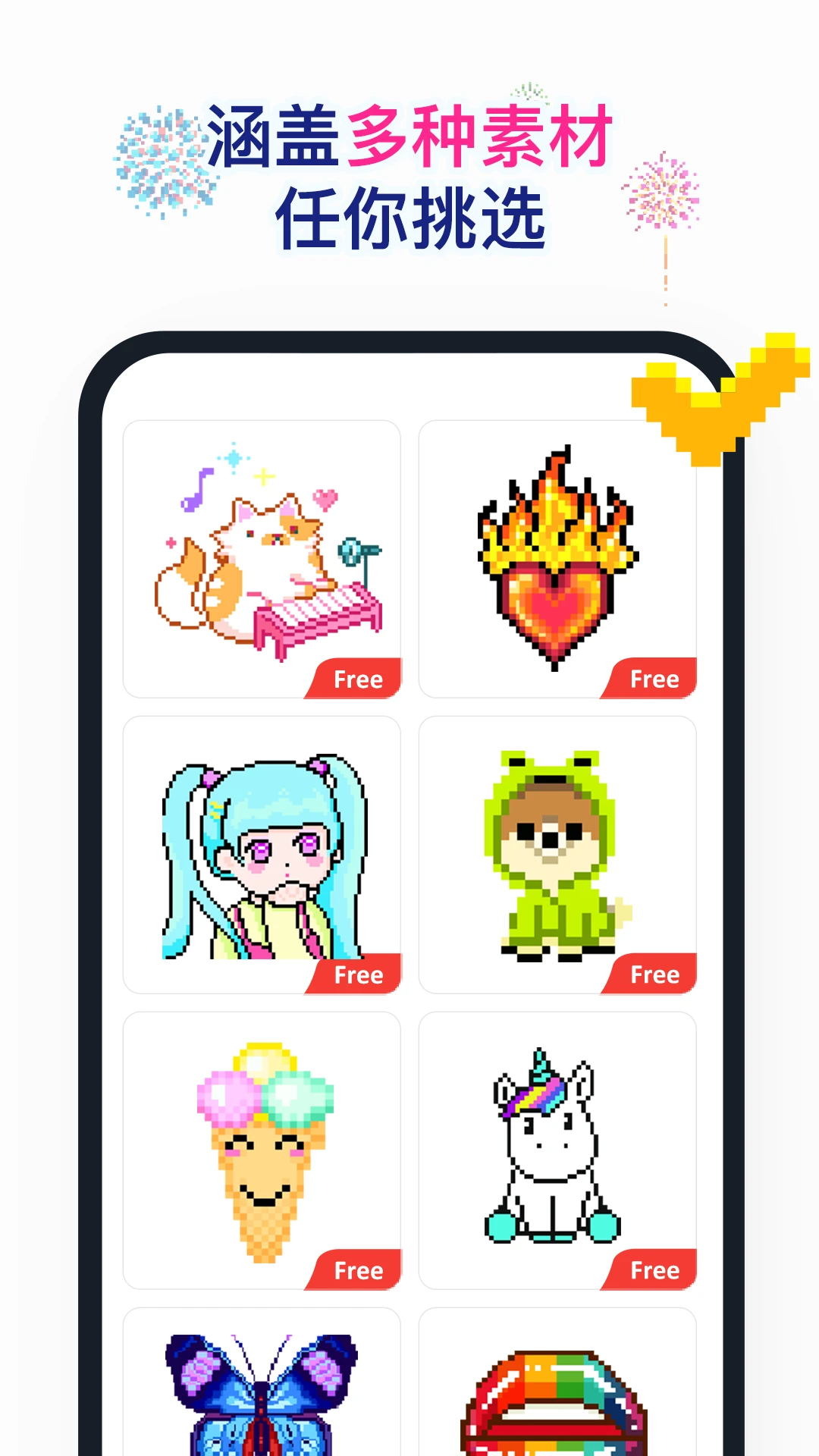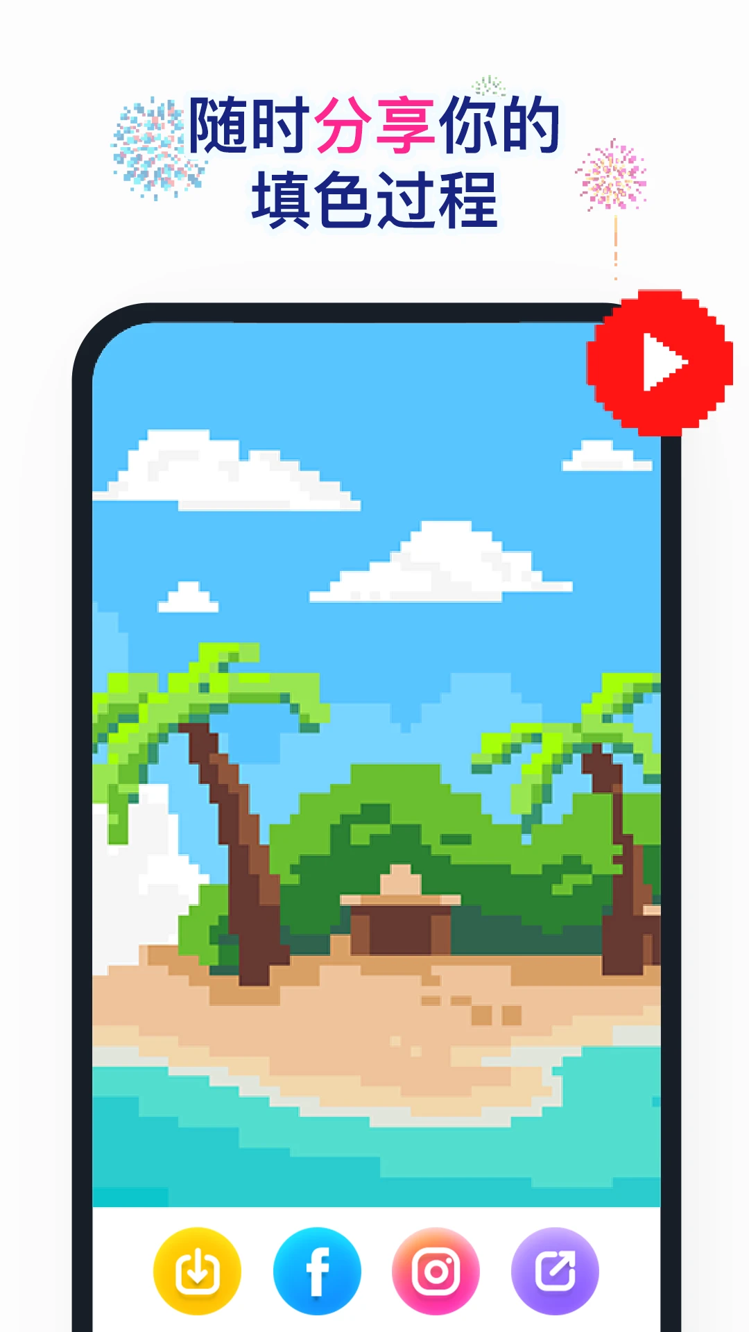 原创像素小镇:包含美食街、海底世界等场景,通过填色建造专属像素花园,体验沉浸式创作乐趣。