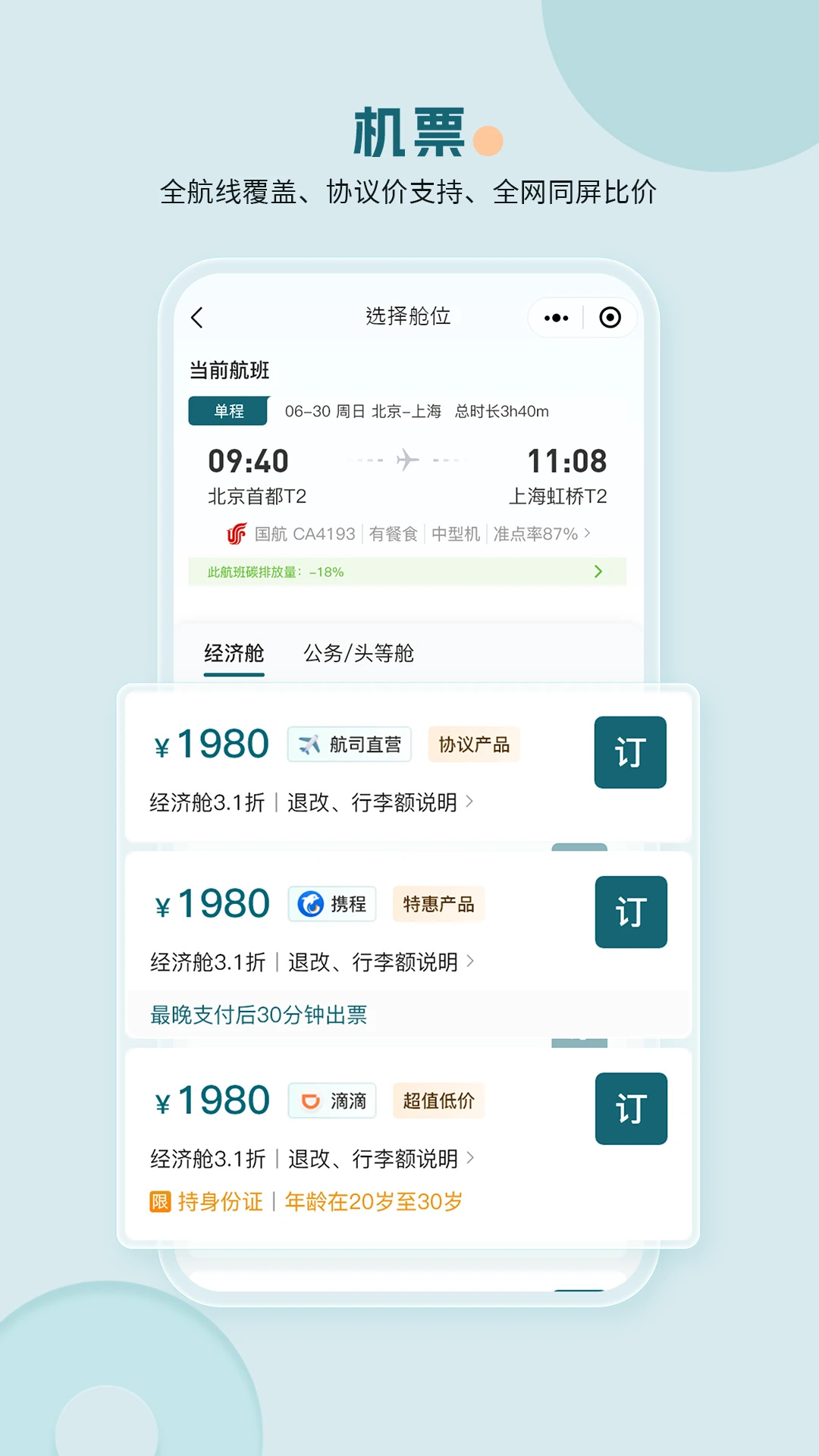 机票预订:覆盖国内航线及协议航空,支持单程、往返、多段与缺口行程预订,提供航班动态提醒与便捷退改签服务。