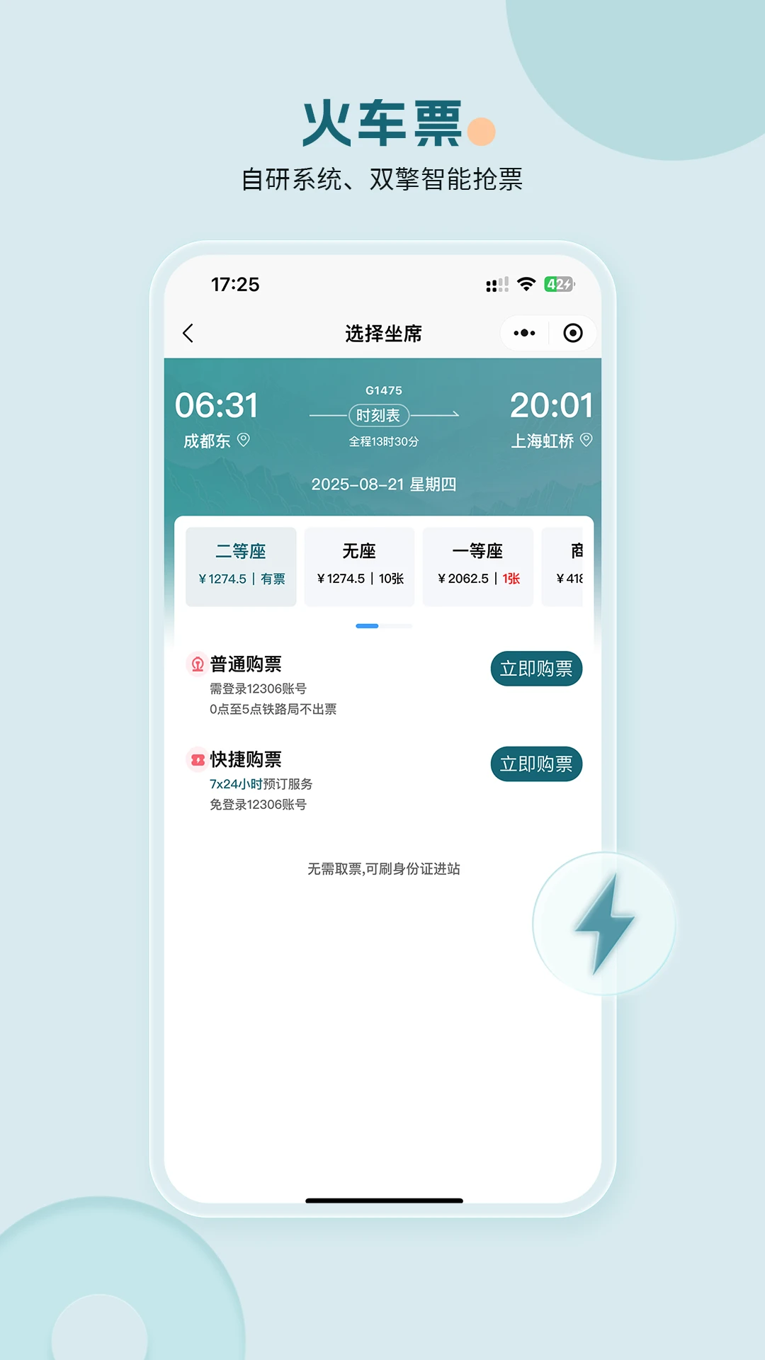 火车票预订:支持高铁、动车及普通列车购票,提供在线选座、退改签及私人订制服务,满足多样化出行需求。
