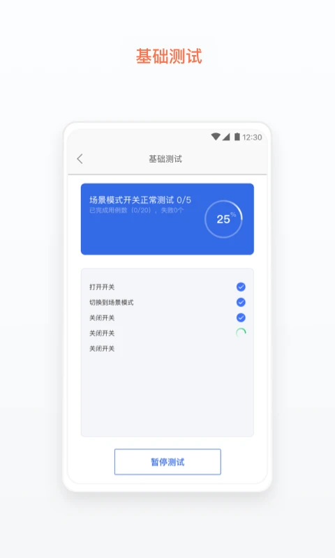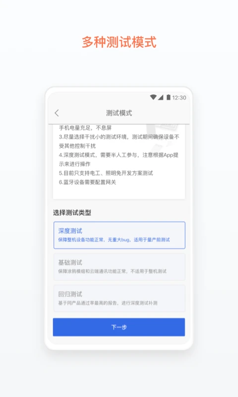 提供手动测试模式,测试人员可以更清晰的看到设备状态变化和App功能状态变化情况;相对基础测试,测试更加全面,覆盖面更广,根据测试用例说明,依次完成自助测试,完成测试后,可以预览测试报告。