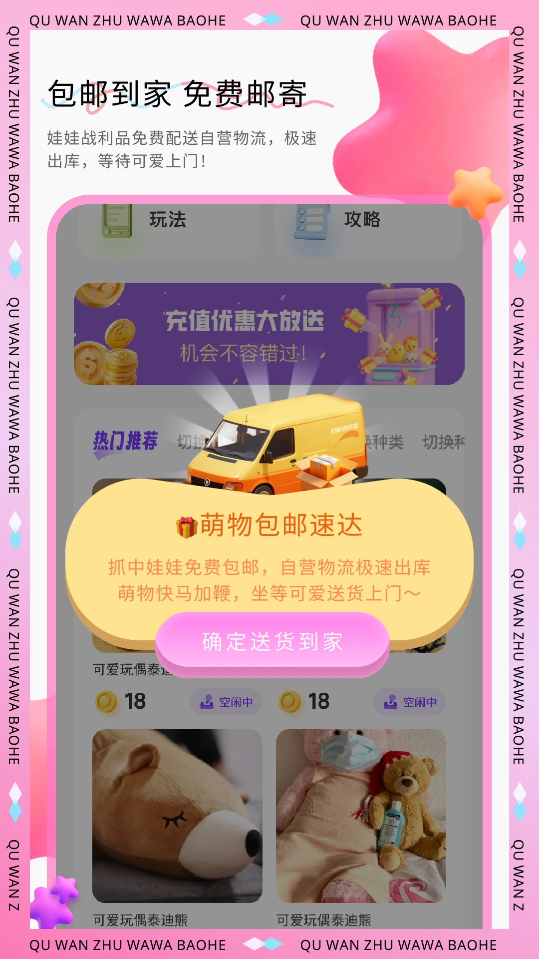 快递送货上门:玩家抓到娃娃后,只需填写收货地址,平台就会将奖品包邮送达