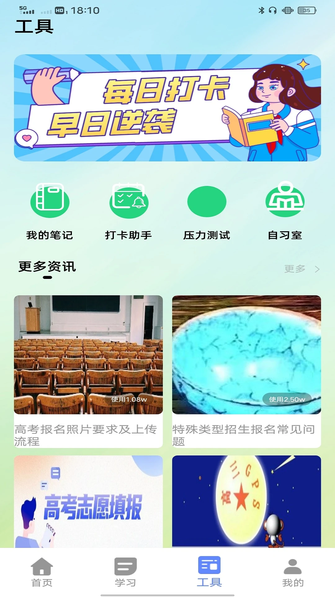 有高考题库、思维导图、学习计划、美文晨读、记忆训练、发表日记、古诗词鉴赏、笔记、打卡助手、压力测试和自习室等功能