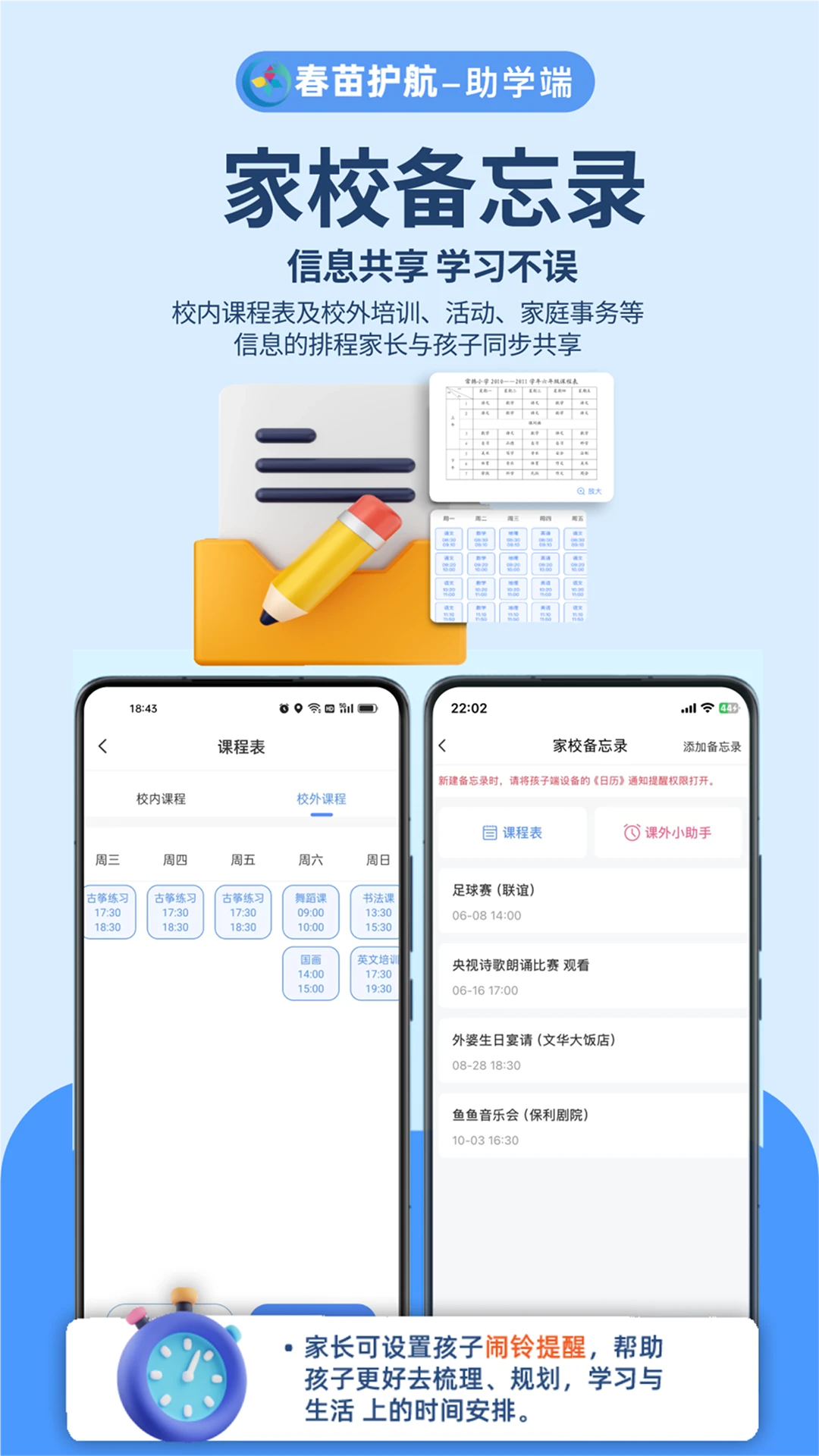 【4.家校备忘录】:校内课程表及校外培训、活动、家庭事务等信息的排程,孩子端可设置事物时间备忘录,可亲子信息同步共享,闹铃提醒,帮助孩子更好去梳理、规划学习与生活上的时间安排。