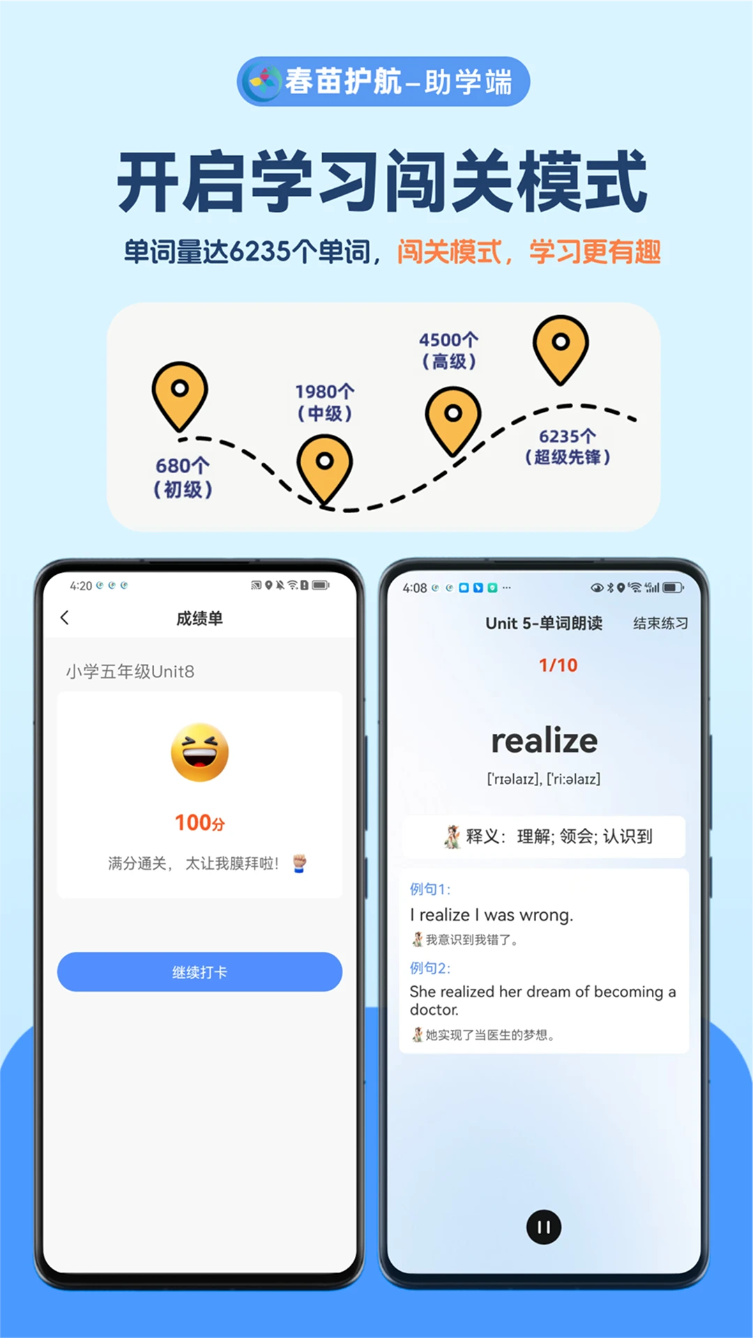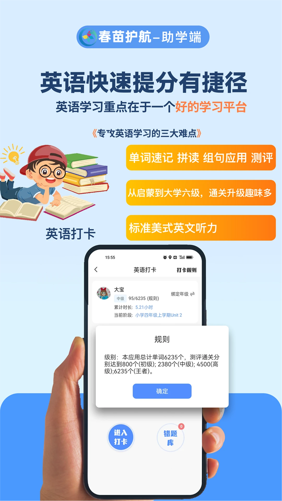 【2.英语打卡】:从英语启蒙到英语六级,总计6235个单词速记、口语练习、组句应用,测评通关,多方位英语学习。家长端可实时获取孩子英语学习打卡时间,时长、通关成绩、累计掌握的单词量。