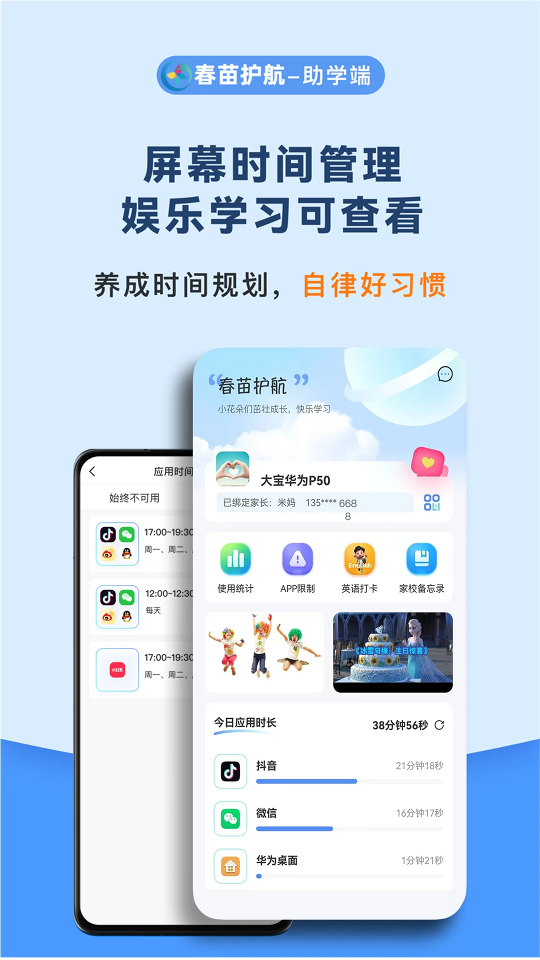春苗护航-助学端:专注守护成长中的青少年,协助孩子做时间的管理与规划,培养自律习惯;安全守护出行;及英语学习打卡;多重应用,不仅是家长守护孩子的智能管家,也是孩子学习的好帮手!【1.APP时间管理】:设定手机APP使用的时间,时长,做时间的规划大师,养成自律习惯。