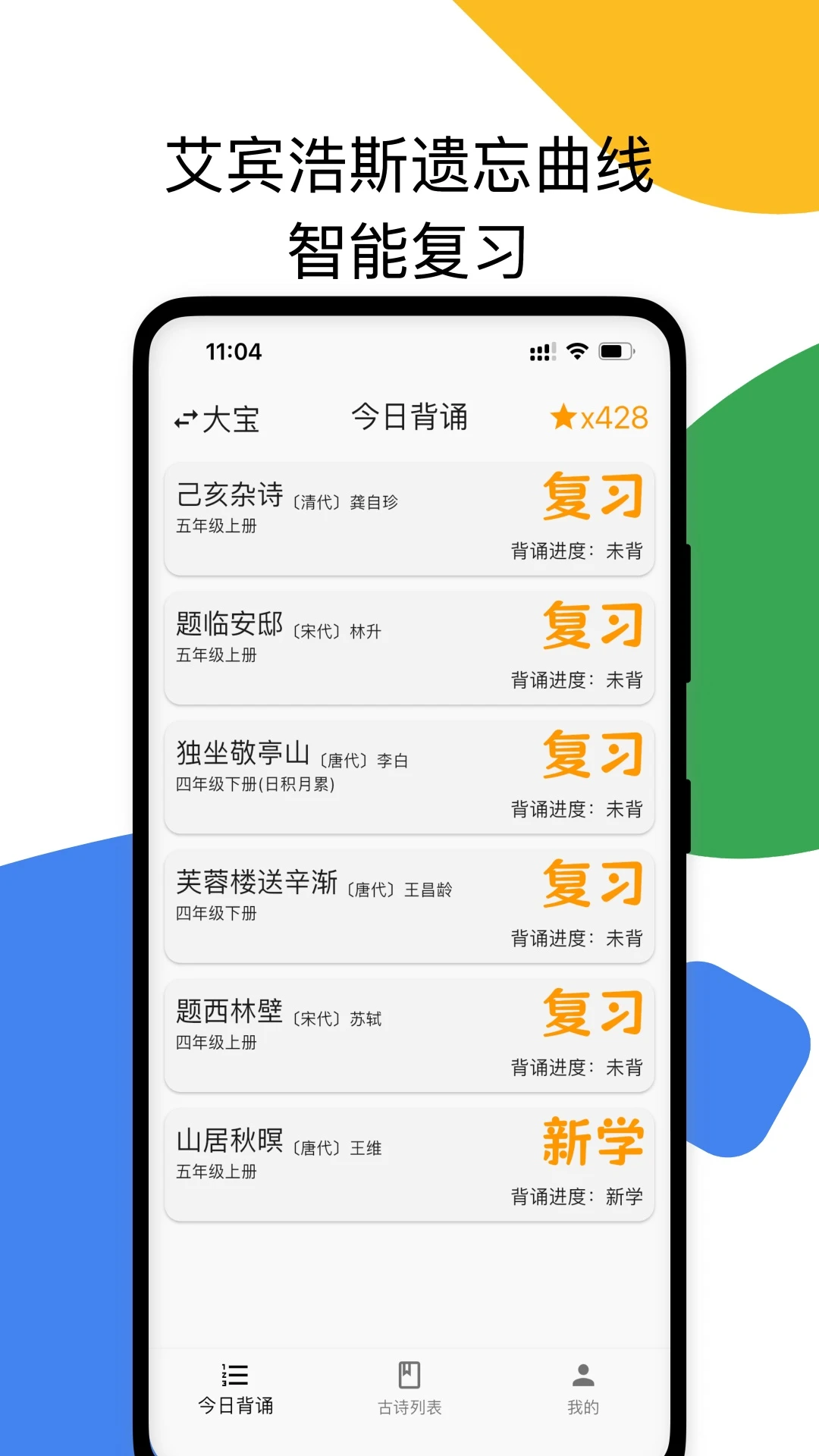 自由选择古诗列表:用户可以根据个人兴趣或学习需求,从丰富的古诗库中自由挑选学习内容,打造专属学习路径。智能学习计划:基于艾宾浩斯遗忘曲线算法,自动生成每日新学与复习任务,科学提升记忆效率,避免无效重复。