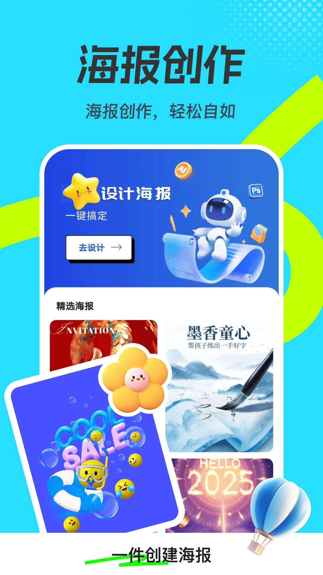 AI搞定设计海报是一款专为设计爱好者和专业人士打造的手机应用,提供一键生成海报、滤镜调色、智能裁剪和黑白上色等功能,让每一次创作都轻松高效。
