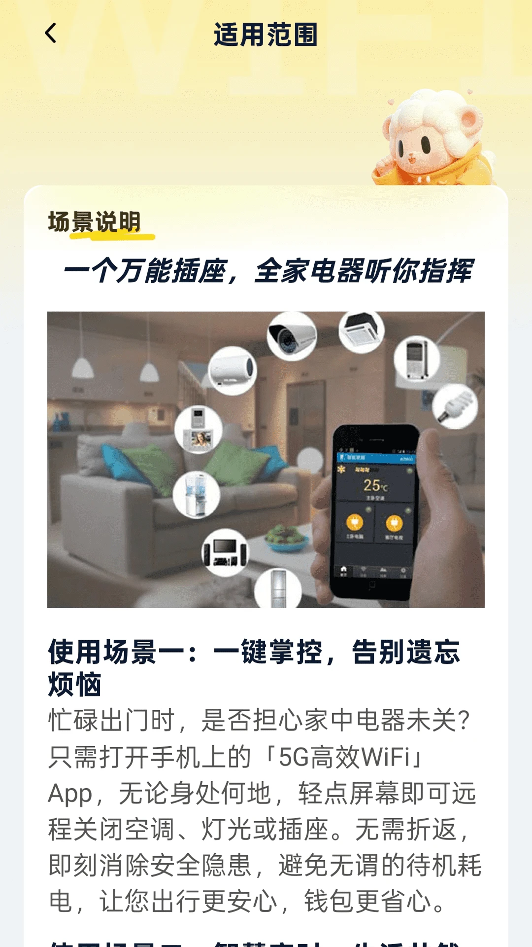 远程操控:无论身处何地,都能通过手机APP远程控制家中电器,解决忘关电器的烦恼。