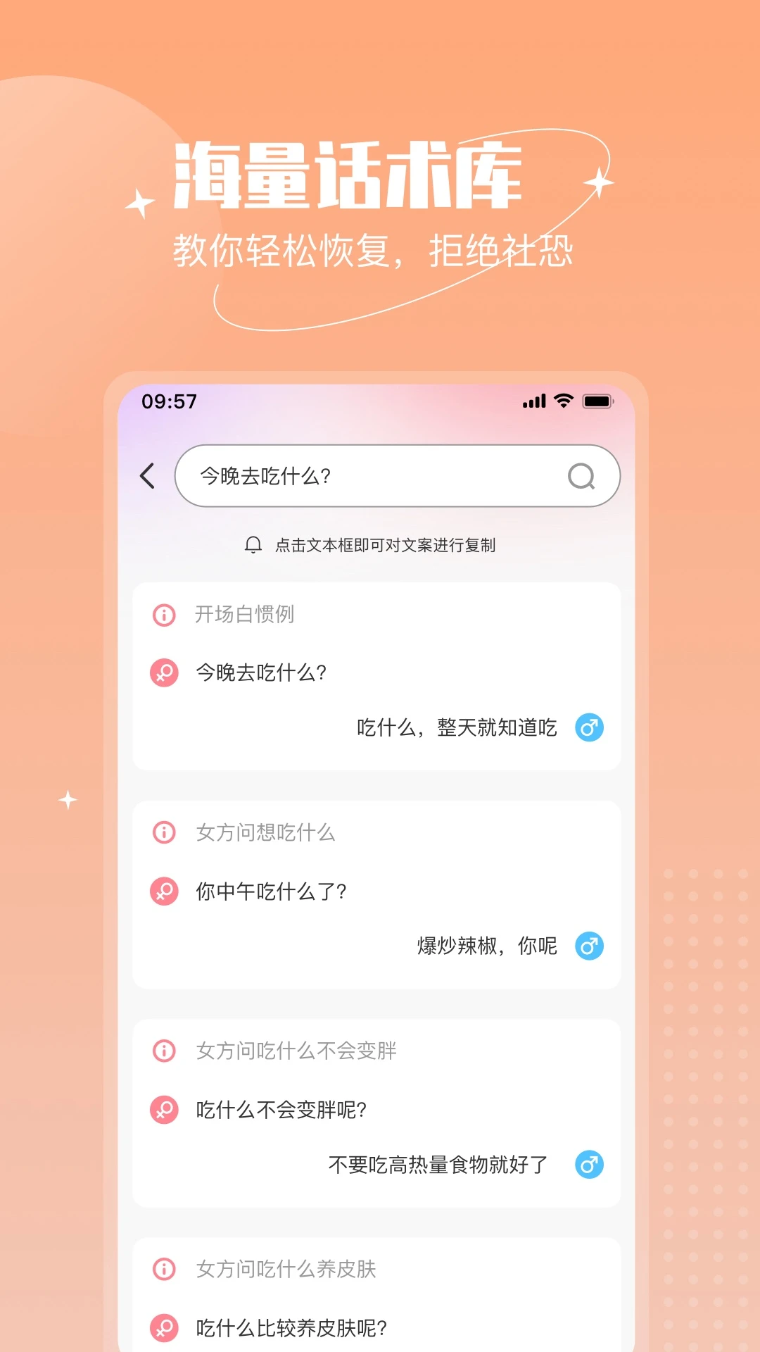 -20W+聊天话术:搜索对方的话,一键复制黏贴获取聊天方案,方便快捷,拉近你们之间的距离。