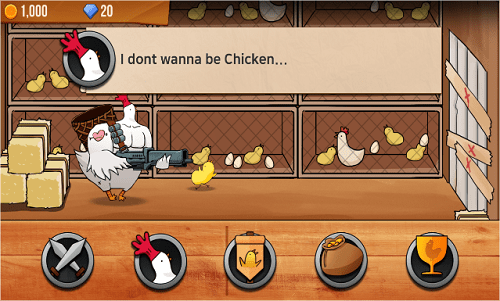 游戏以诙谐幽默的方式讲述了一个关于"鸡群起义"的精彩故事。玩家需要操控一只全副武装的战斗鸡,与前来捕捉鸡群的人类展开激烈对抗。游戏的核心目标是摧毁那些贩卖鸡肉的餐厅,解放被囚禁的同伴。随着游戏进程推进,你可以招募更多各具特色的小鸡伙伴加入战斗,组建属于你的"复仇者鸡盟"!游戏操作简单直观,左侧虚拟摇杆控制移动,右侧按钮负责攻击和技能释放,即使是新手玩家也能快速上手。