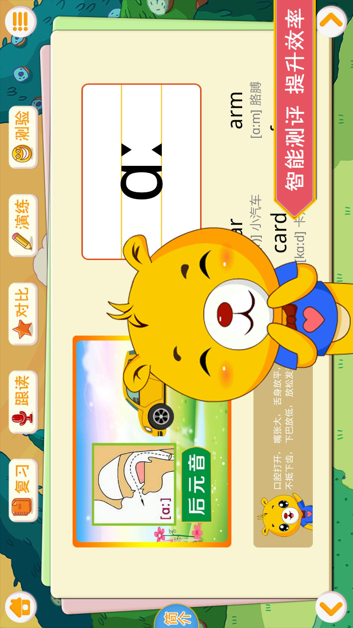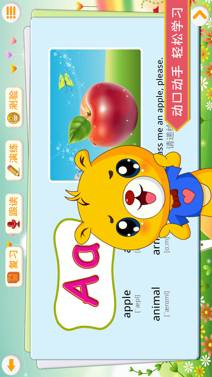 软件采用生动有趣的卡通图画和互动设计,让宝宝在轻松愉快的氛围中学习英语。26个英文字母不仅配有标准发音示范,还提供大小写书写演练功能,帮助孩子掌握正确的书写笔顺。48个国际音标配有详细的发音方法图解和4组常用单词示例,通过反复练习强化发音训练。独特的五维互动学习法充分调动手、眼、耳、口、脑五大感官,让学习过程更加立体高效。