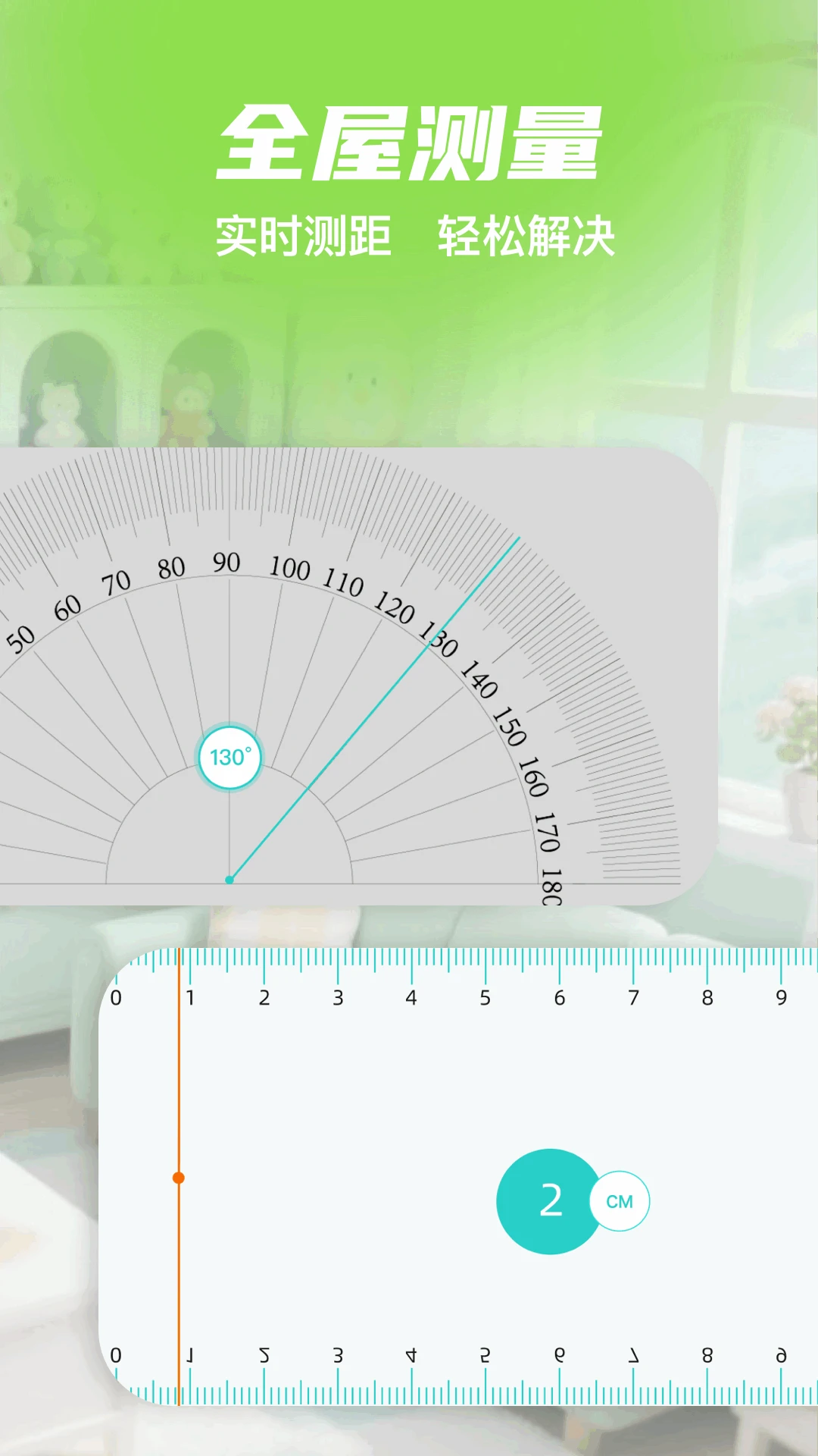 -全屋测量:角度尺精准测角,不管是房屋空间、家具尺寸测量,全屋测量难题轻松解决,让装修前的基础测量一步到位。