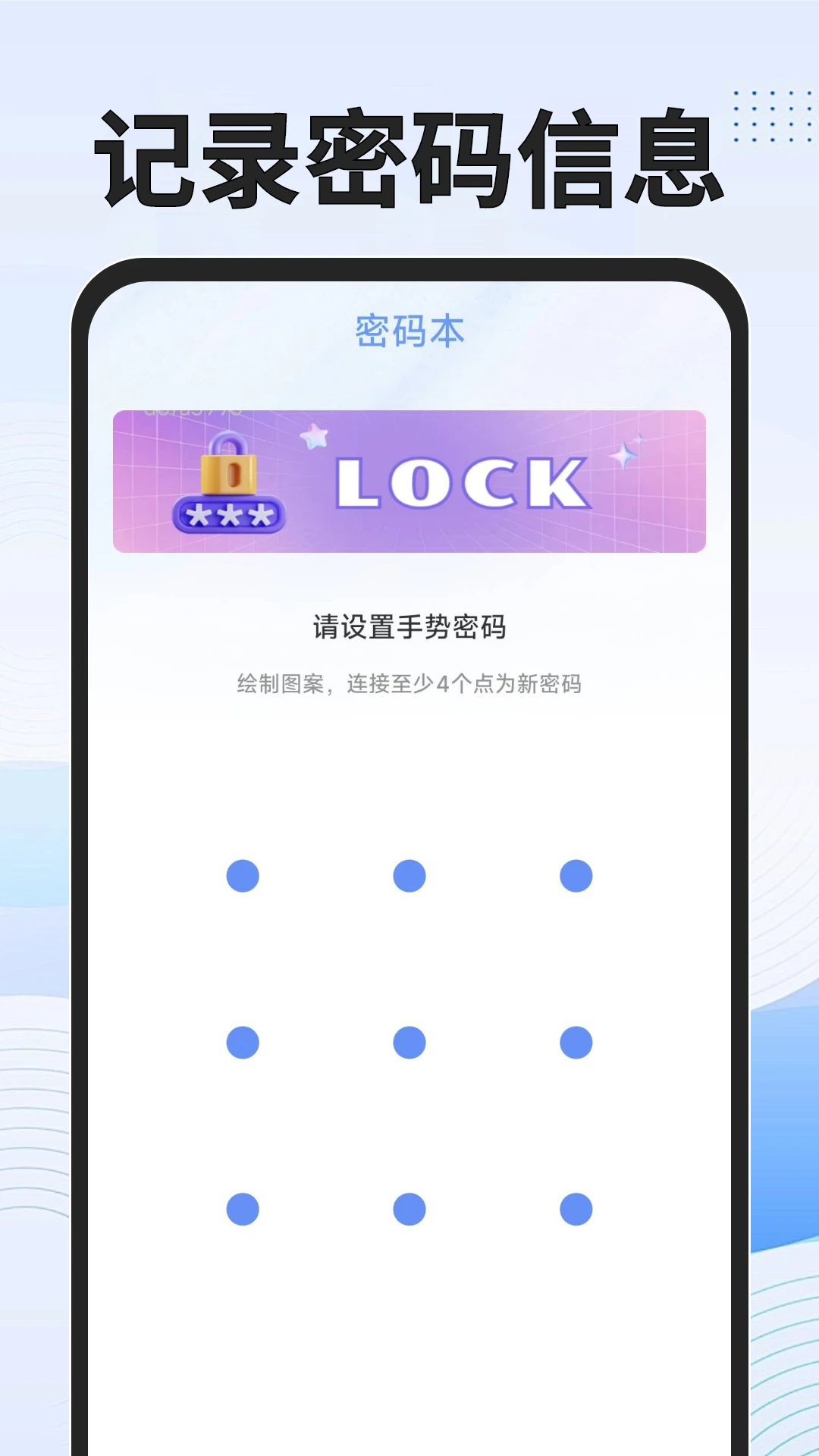 密码管理功能采用手势加密,安全存储各类账号密码信息。