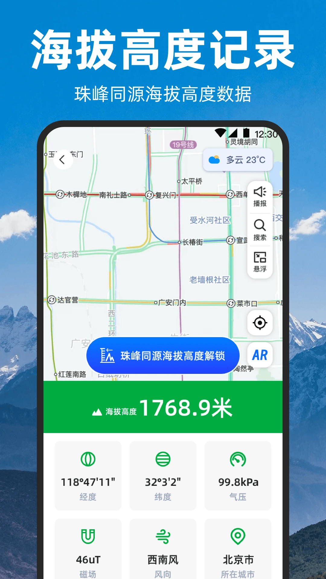 1.海拔测量:采用高精度GPS与气压传感器双重校验技术,快速准确地测量您当前位置的海拔高度,无论是山川湖海,还是都市高楼,都能轻松掌握。