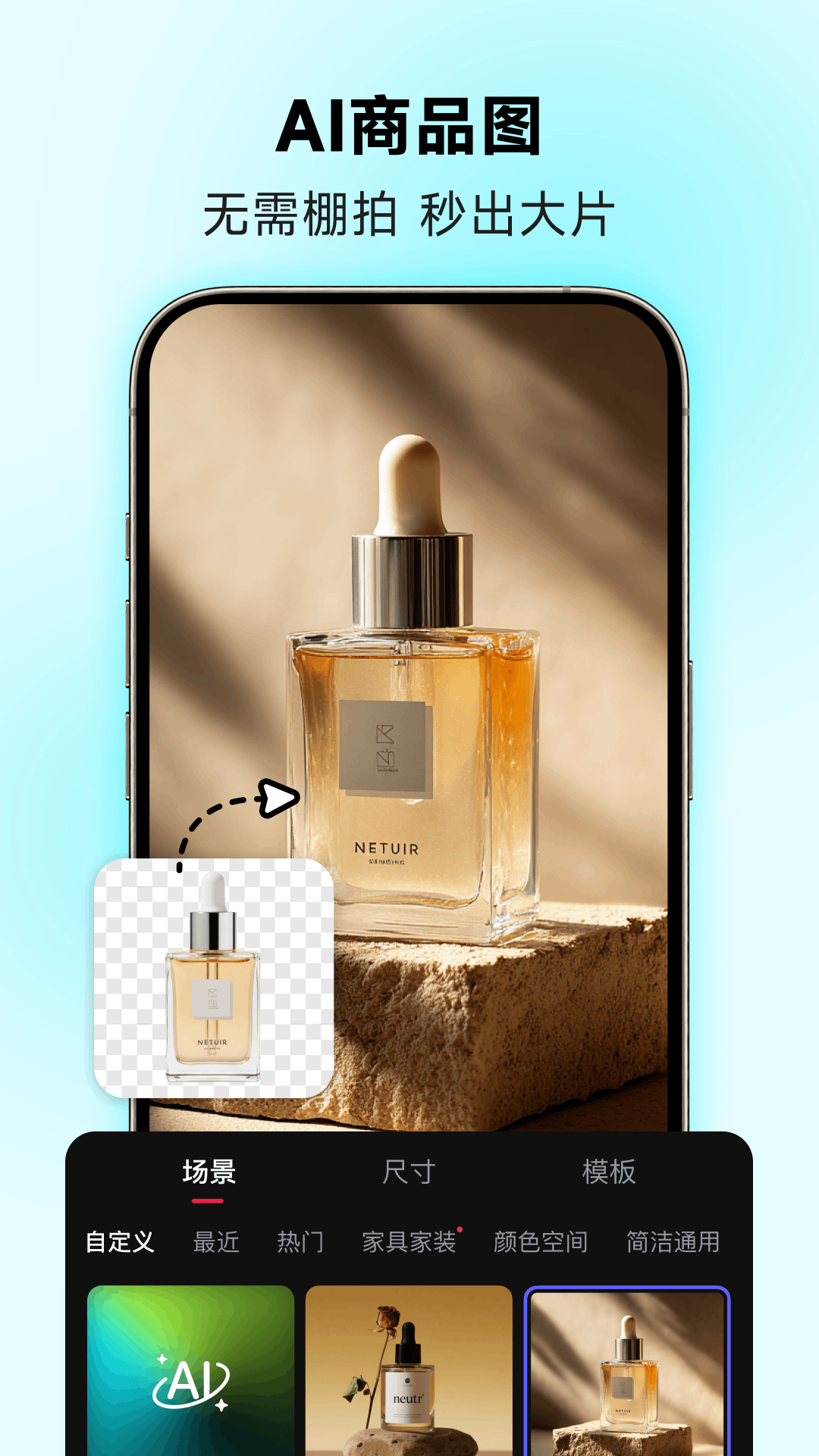 针对社交媒体营销需求,美图设计室特别推出了「AI商品图」功能,上传产品照片即可自动生成多场景应用图,让商品展示更生动;「智能抠图」采用先进识别技术,能精准处理各类复杂边缘,实现一键换背景;还有「画质修复」功能,可将模糊图片瞬间提升至4K超清画质,让老照片重获新生。