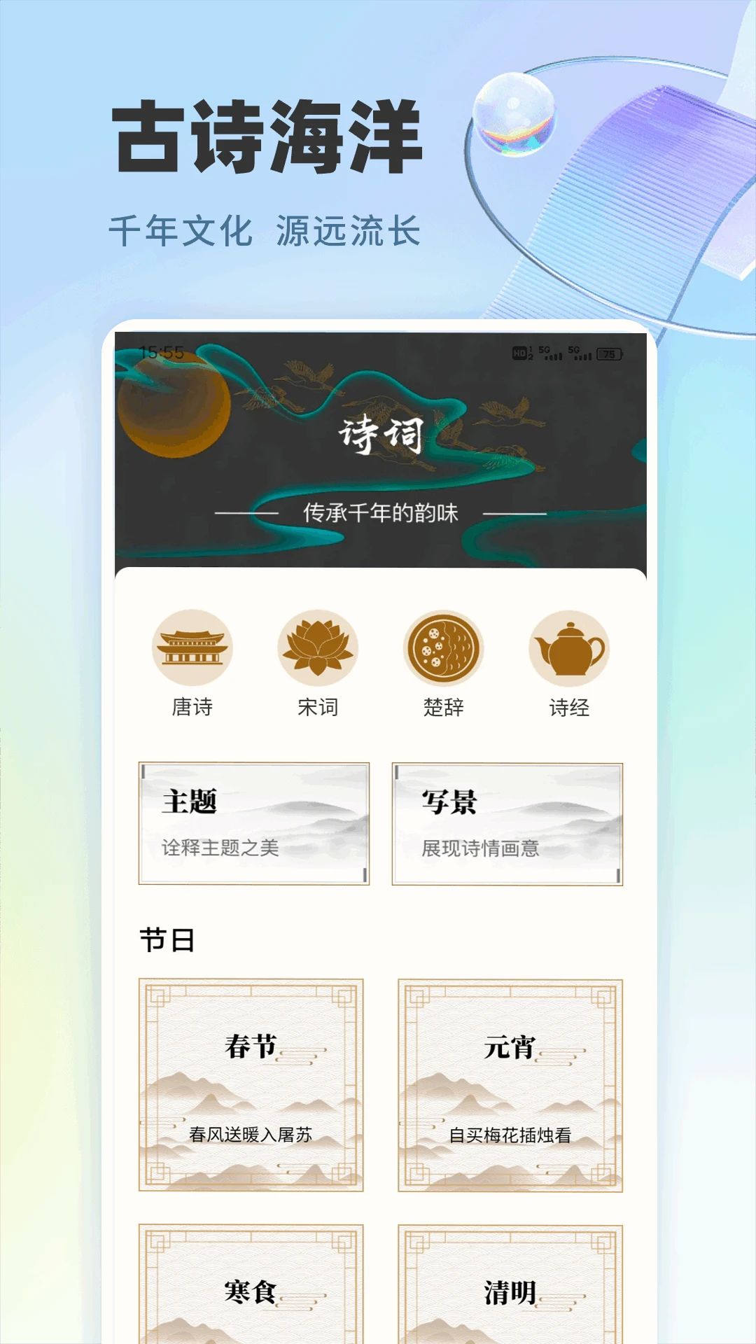 古诗词支持语音跟读和默写模式,强化记忆效果