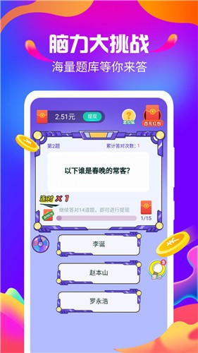 答题来赚钱红包版是一款趣味十足的益智答题游戏,玩家可以通过回答各类问题赢取真实红包奖励。游戏提供了丰富多样的答题模式,从生活常识到专业知识应有尽有,每个关卡都设置了丰厚的红包奖励。随着答题正确率的提升,玩家可以解锁更高难度的挑战,获得更丰厚的回报。每日登录还能领取额外奖励,让玩家在轻松愉快的氛围中增长知识,同时获得实实在在的收益。游戏操作简单易懂,适合各个年龄段的玩家参与体验。