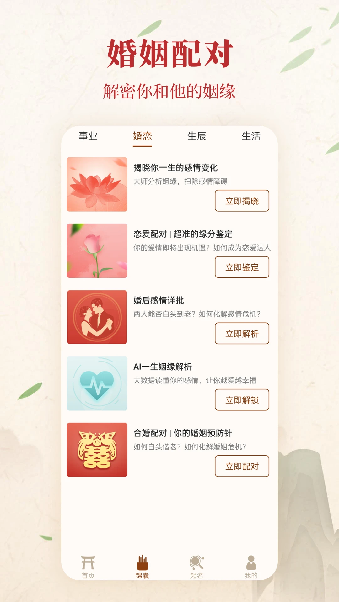 姻缘配对:通过双方姓名和生辰,分析彼此属性,预测感情发展走向。