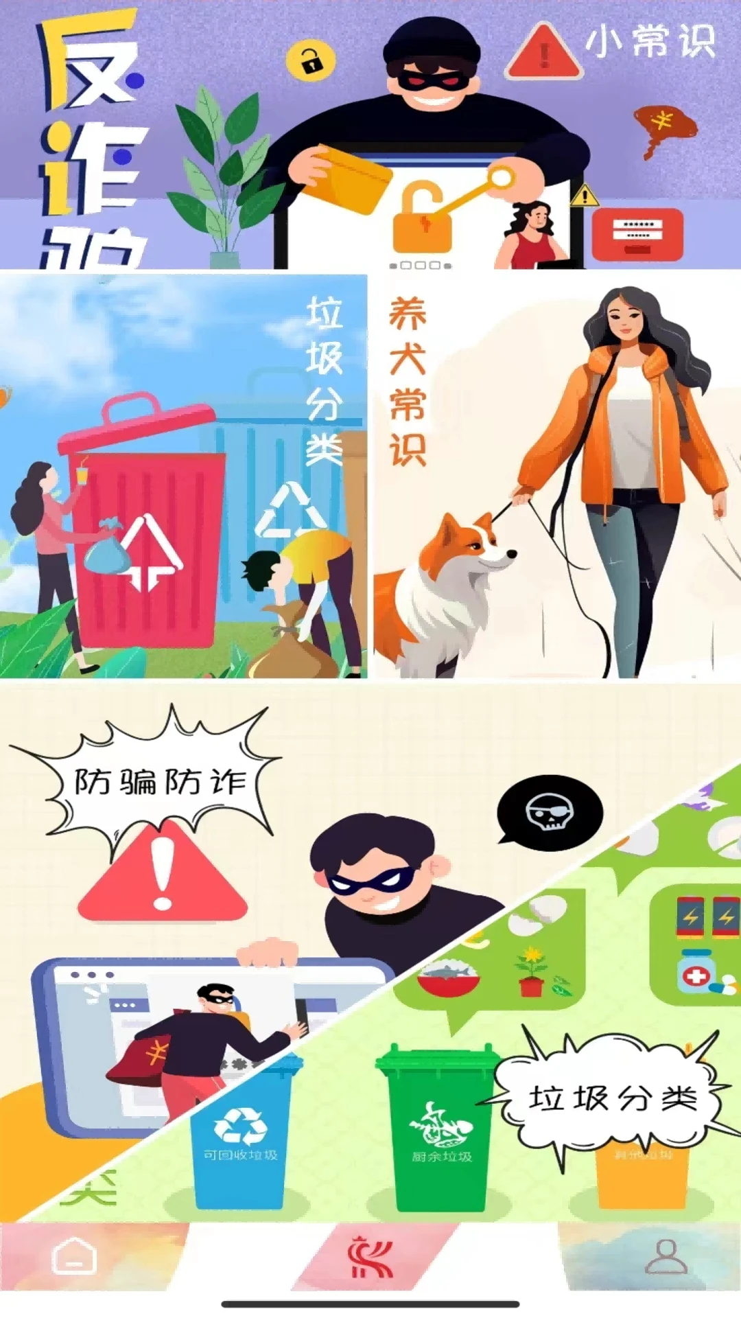 是一款针对民生类的公民趣味自测锦囊型小工具,本软件通过卡通的风格进行绘制,意在让用户闲暇之余可以更加轻松地了解新防电诈及垃圾分类的内容。