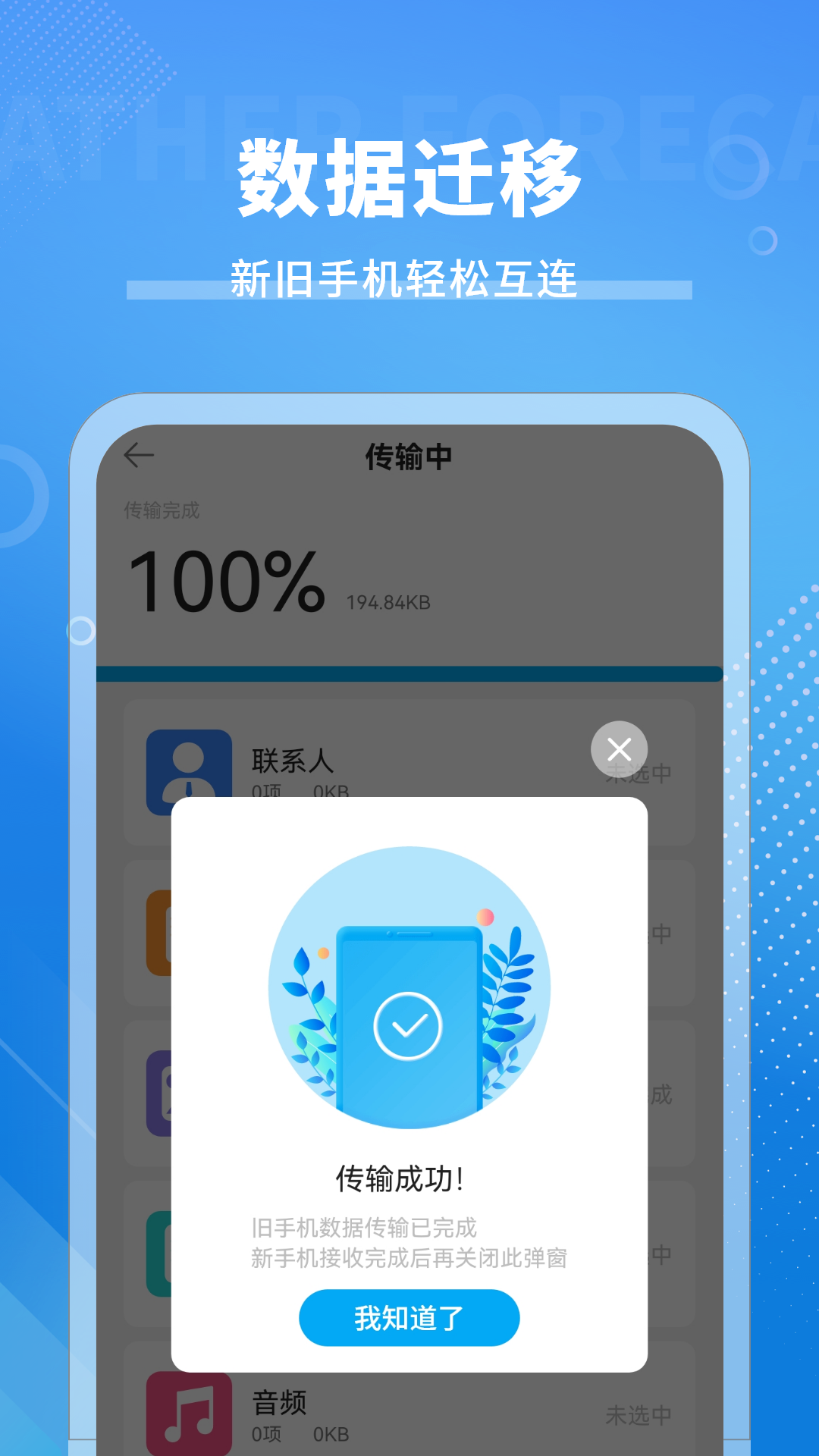 手机克隆是一款功能强大的数据传输工具,能够全面支持各种类型的文件传输,包括照片、视频等多媒体文件,以及超大容量的文档。它采用先进的传输技术,确保文件在传输过程中保持高速稳定,即使是超大文件也能快速完成传输,为用户节省宝贵的时间。