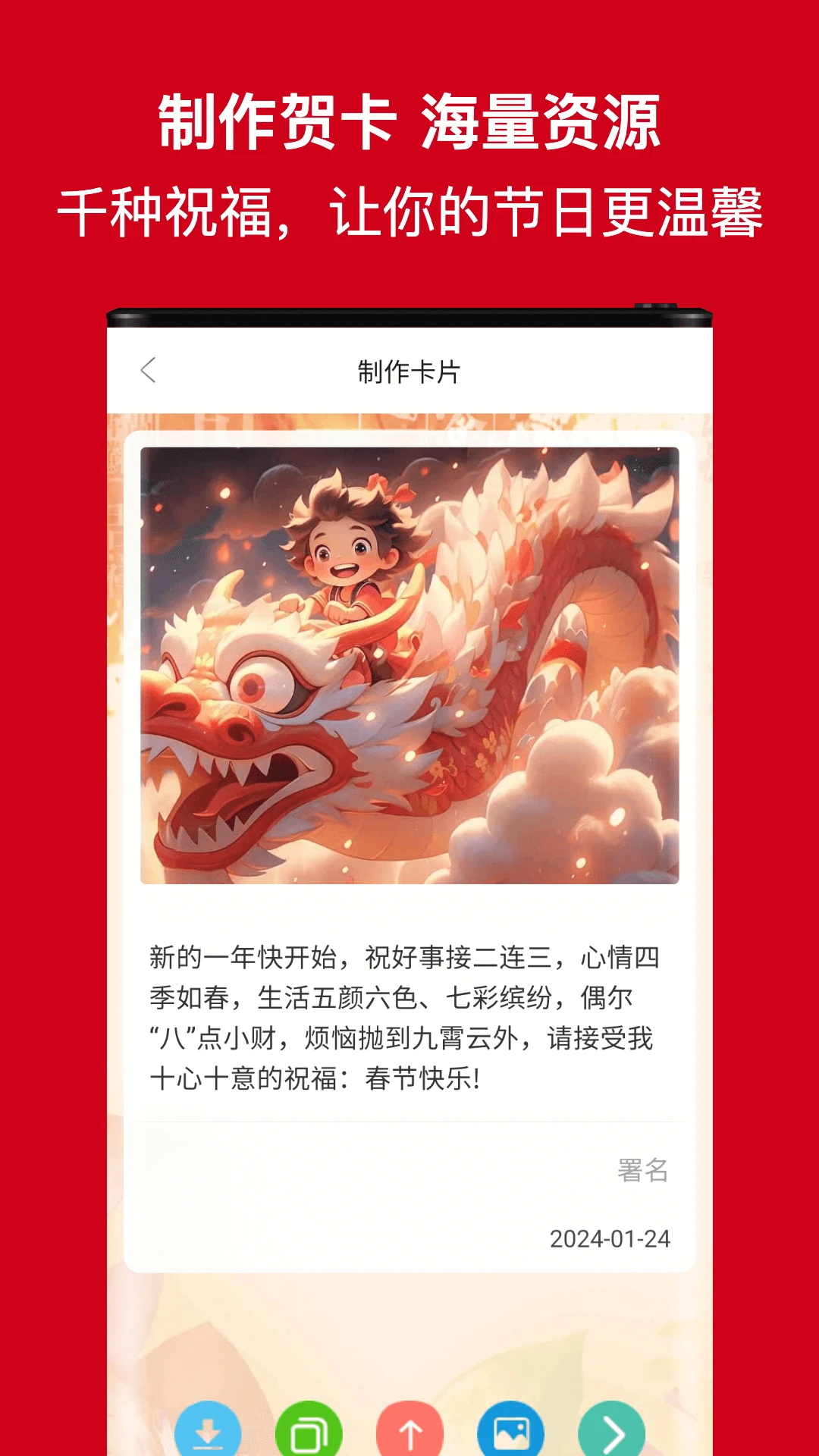 个性化定制:用户可以根据自己的喜好调整贺卡样式和祝福语内容。操作简单便捷:界面设计直观,即使是初次使用的用户也能快速上手。