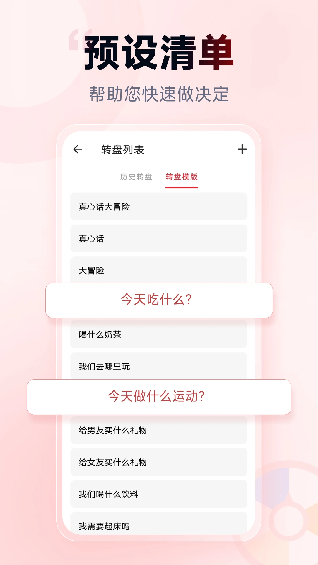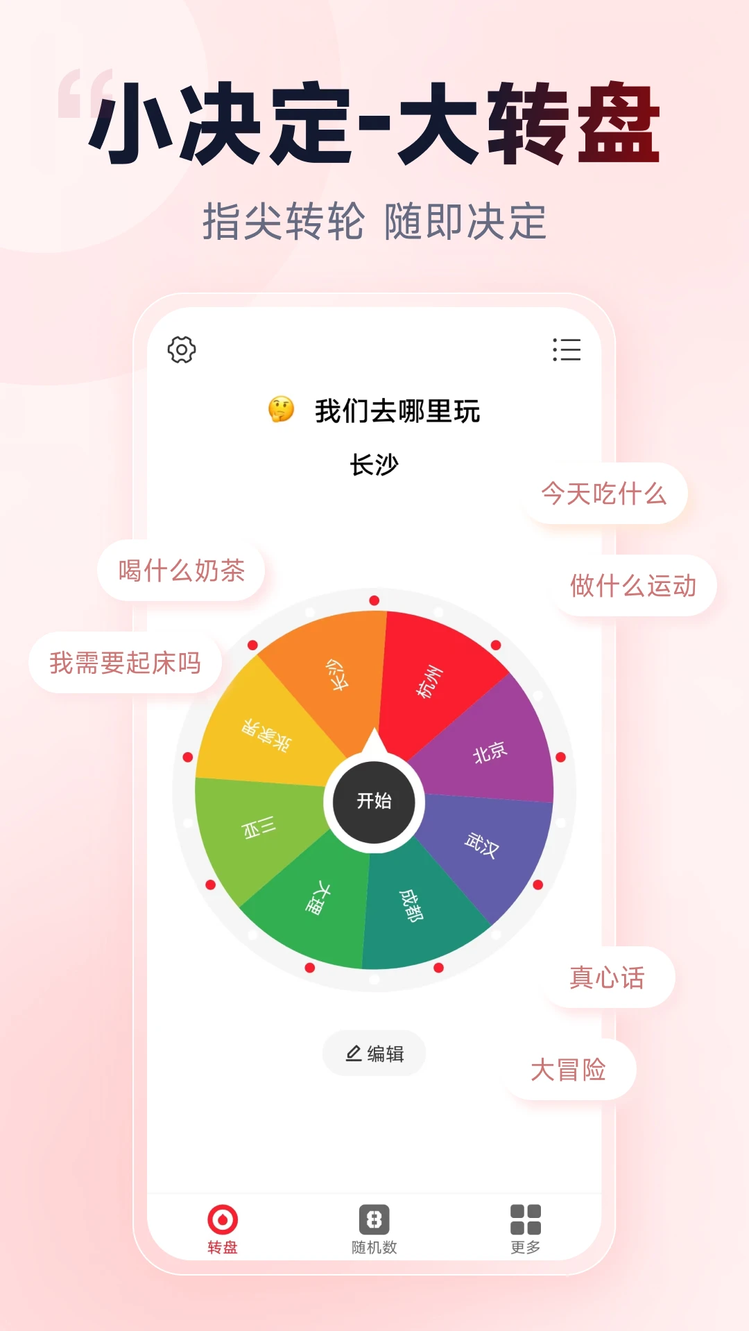 小转盘做决定是一款集趣味性与实用性于一体的随机决策工具,专为选择困难症用户设计。无论是日常琐事还是聚会游戏,它都能通过转盘、骰子、硬币等多样化方式,将复杂选择转化为轻松有趣的互动体验。软件内置智能随机算法,支持自定义选项权重和主题皮肤,从晚餐选择到酒桌游戏,从家庭分工到冒险挑战,只需轻轻一点,让纠结的难题迎刃而解。其简洁直观的界面和丰富的功能模板,让它成为个人决策与团体娱乐的必备神器。