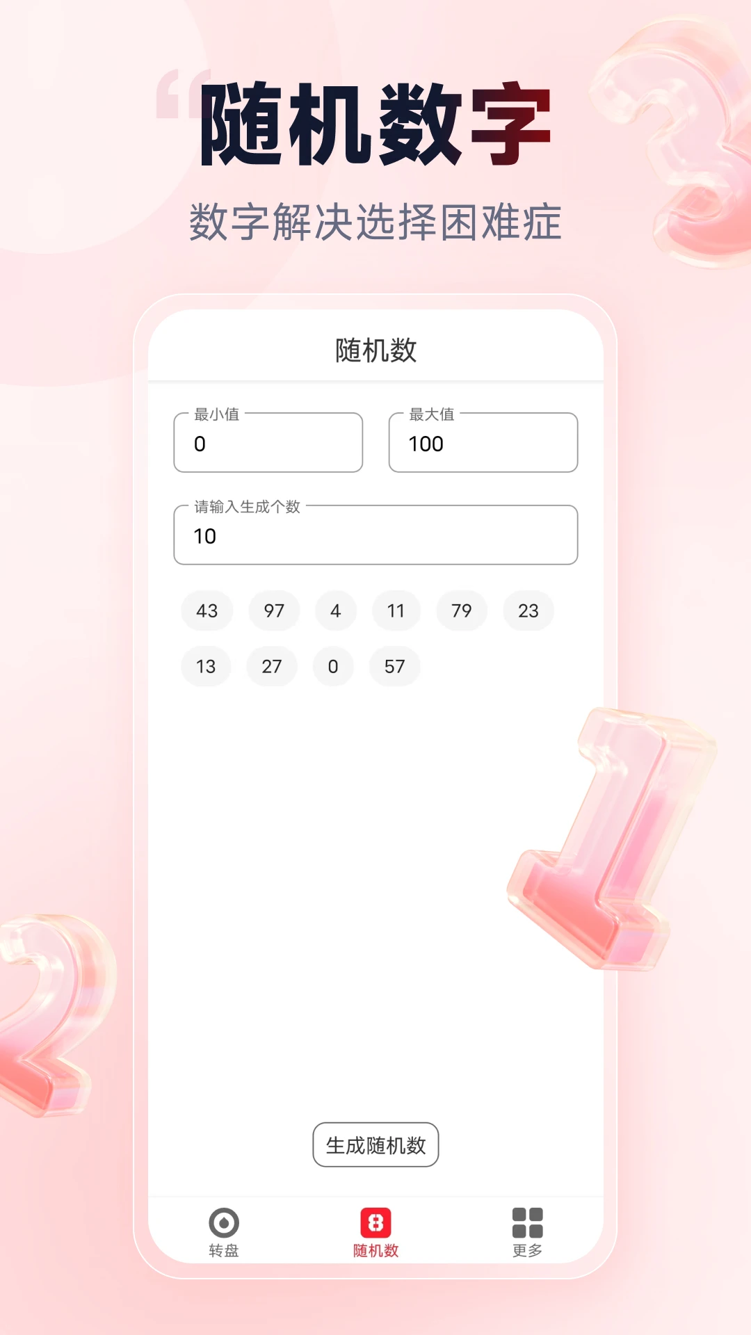 多模式随机生成:除经典转盘外,提供骰子(1-6点)、硬币(正反面)、数字区间(如1-100)三种随机工具。