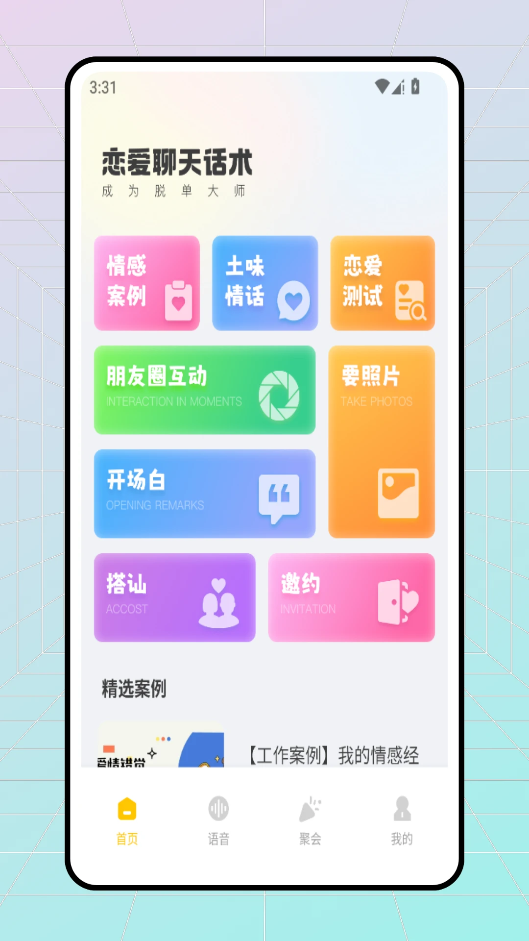 聊天文案库覆盖搭讪开场、日常互动等场景,一键复制就能让对话自然升温。语音倒放功能超有趣,录制语音或文字转换后倒放,能玩起猜谜挑战,笑声不断。聚会娱乐板块更贴心,内置真心话、摇骰子等小游戏,轻松点燃气氛,告别低头沉默。