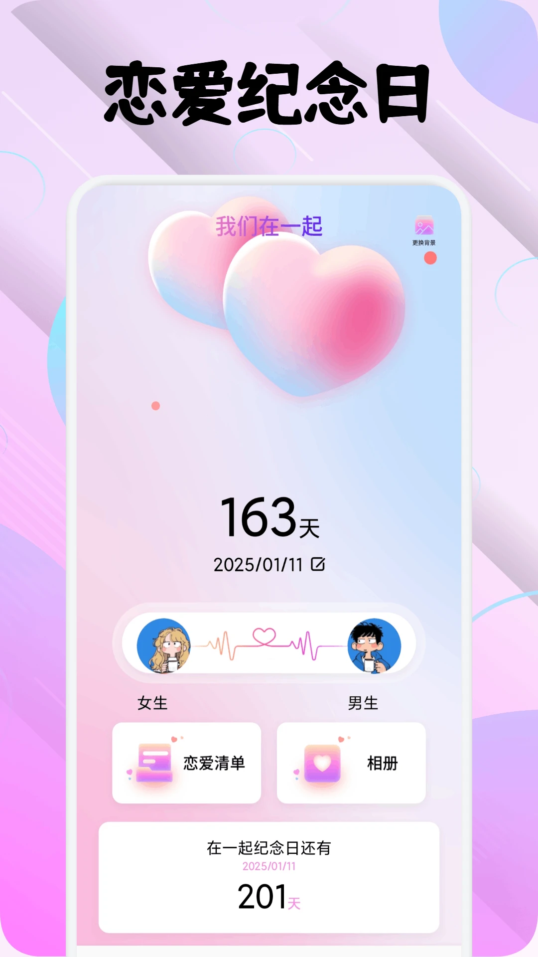 这是专为情侣打造的"恋爱成长纪念册",将爱情中的点点滴滴转化为可视化的甜蜜回忆。这款创新应用通过数字化方式记录恋爱历程,帮助情侣们珍藏每一个心动瞬间。从恋爱天数计时到重要纪念日提醒,从共同愿望清单到私密日记空间,它用科技温暖爱情,让两个人的故事以更生动的方式被铭记。无论是热恋中的情侣还是稳定期的伴侣,都能在这里找到专属的情感记录方式,让爱情在数字时代依然保持最真挚的温度。