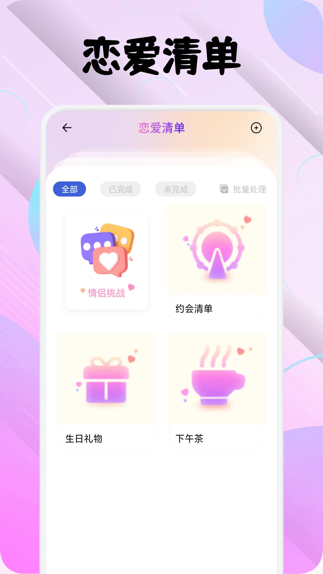 共同愿望清单:内置丰富的恋爱打卡项目,从日常小事到人生大事应有尽有