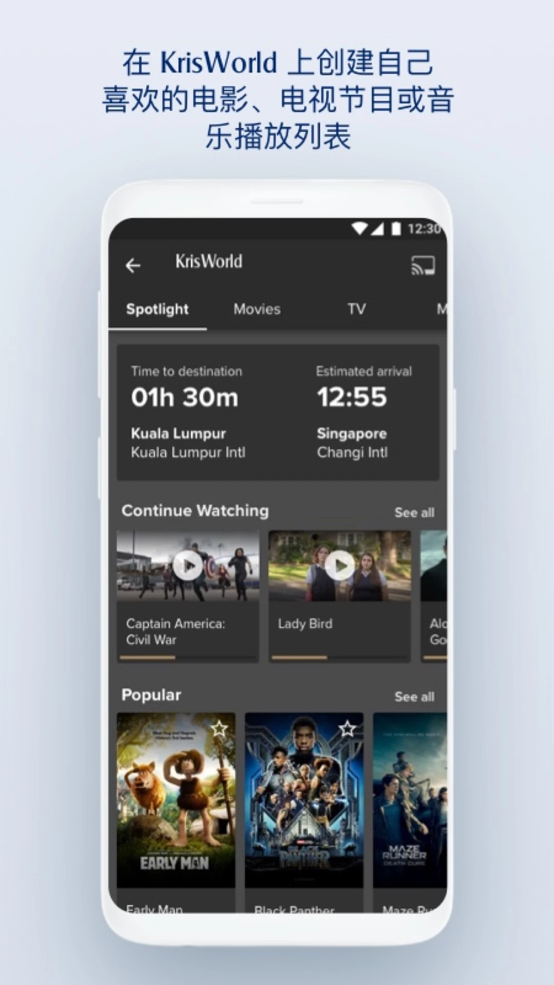 机上娱乐预览:提前浏览KrisWorld娱乐内容,规划飞行期间的观影清单。