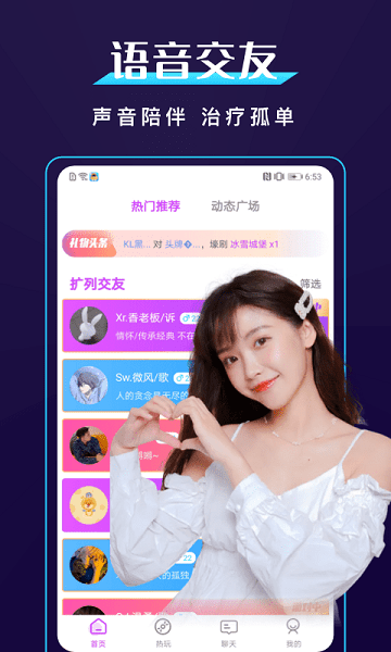 cpdd、唠嗑、扩列交友、陪玩、唱歌、更有超多热门游戏大神语音连麦带你飞;十拿九稳!一起来互动吧。广场内设有智能推荐系统,能根据你的社交习惯自动匹配潜在好友。每日更新热门话题和活动,让你永远不愁找不到聊天话题。