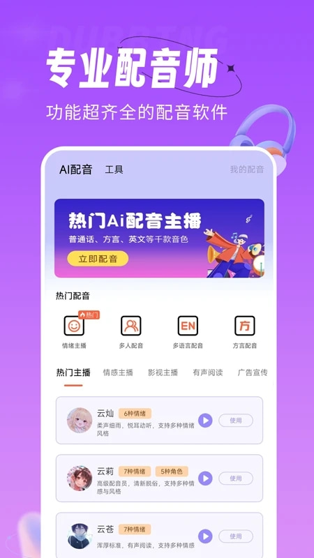 首页功能区域:主打配音服务,设有热门主播入口,提供情绪主播等多种分类,方便用户快速选择不同风格的配音。