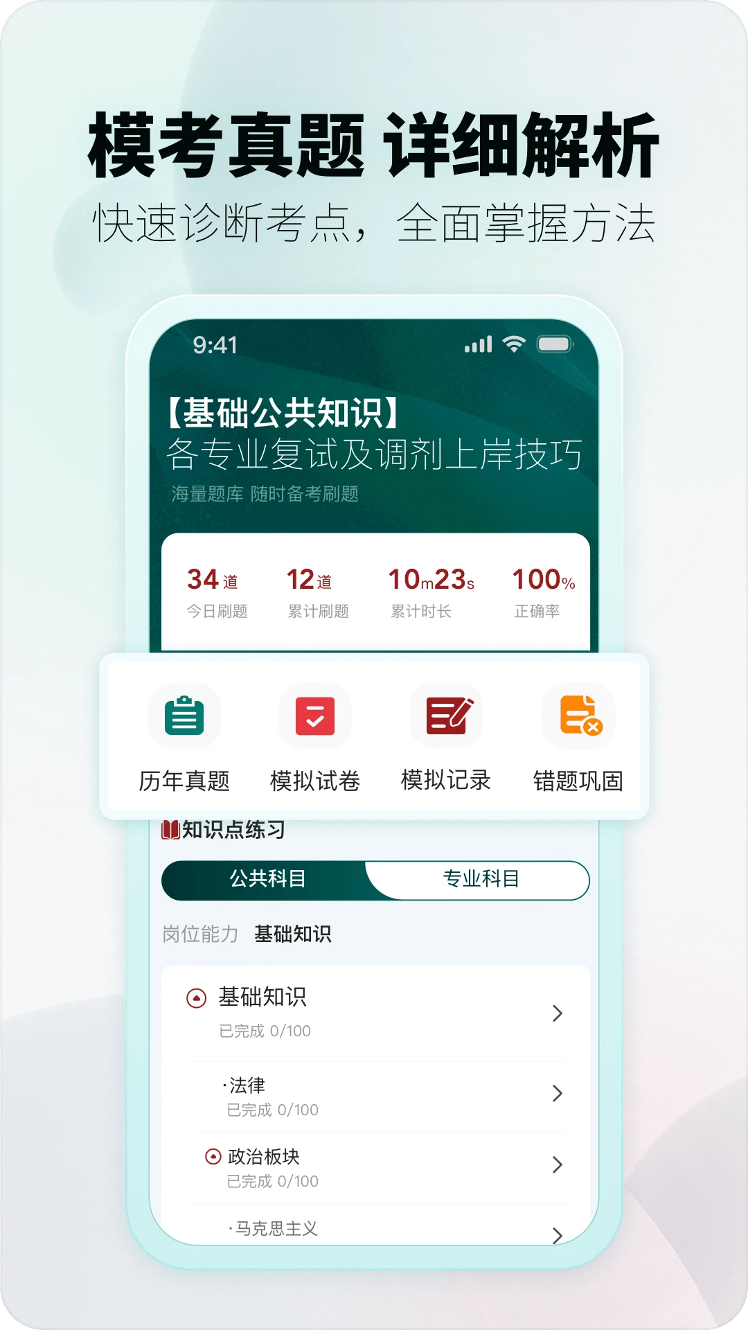 4.海量题库全新海量题库,覆盖多个科目,章节练习,历年真题,模拟测试,错题巩固,自适应练题巩固,轻松备考。根据目标考试的考点,考频,难度,用人工智能算法实现一对一智能出题;通过记录用户练习情况,生成数据评估报告,预测考分。