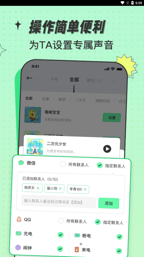【便捷设置】简洁直观的操作界面,让你可以快速为联系人、闹钟、通知等设置不同的铃声,操作简单到只需几步点击。