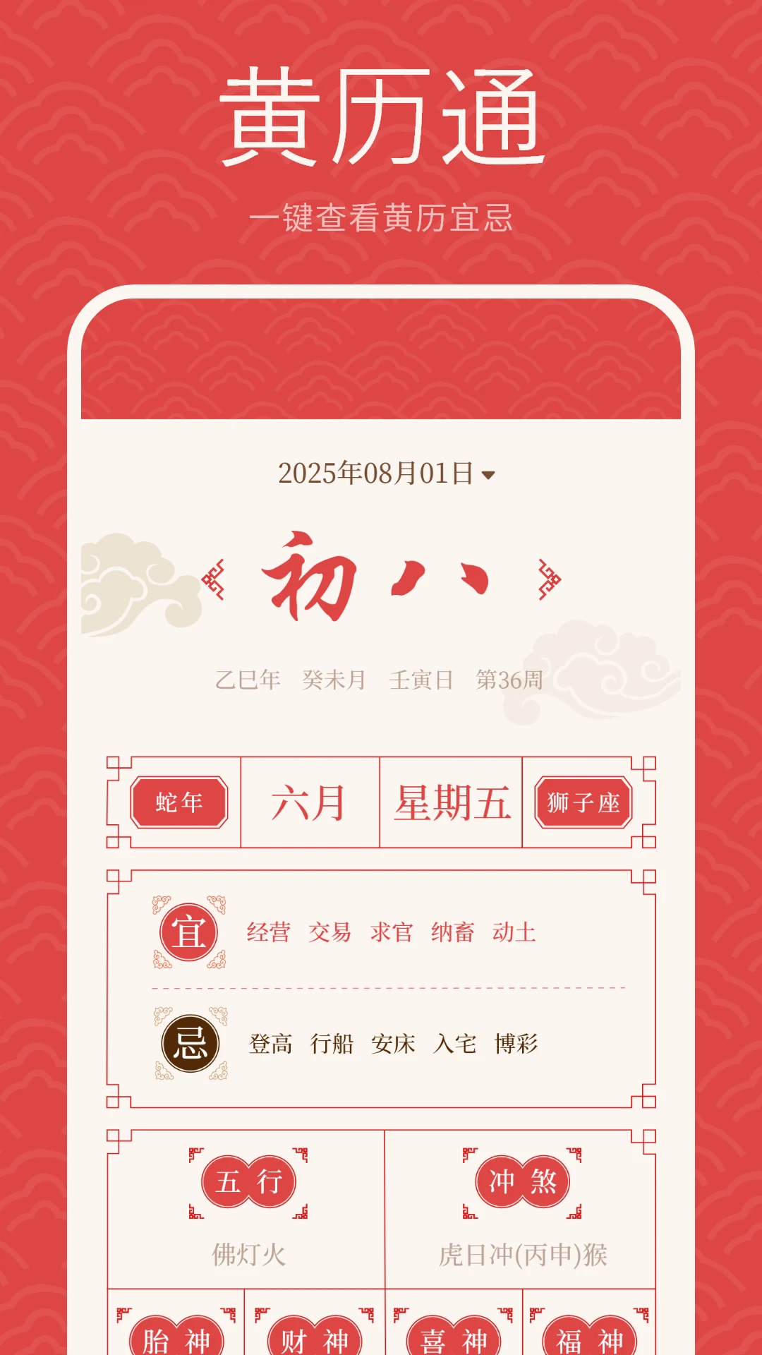 黄历功能包含宜忌事项、吉时推荐,辅助用户规划重要活动。