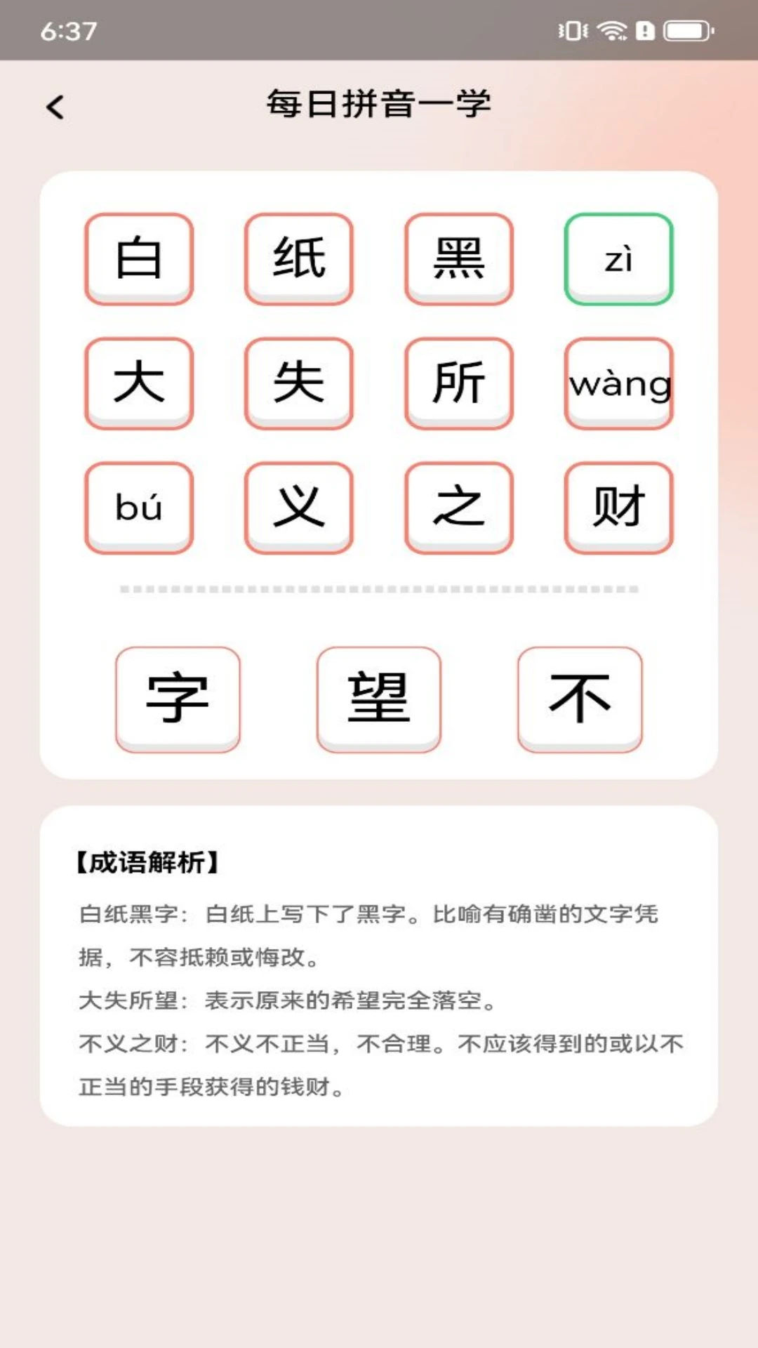 成语与拼音学习模块:通过生动有趣的例句和练习,帮助用户轻松掌握汉语成语和拼音。