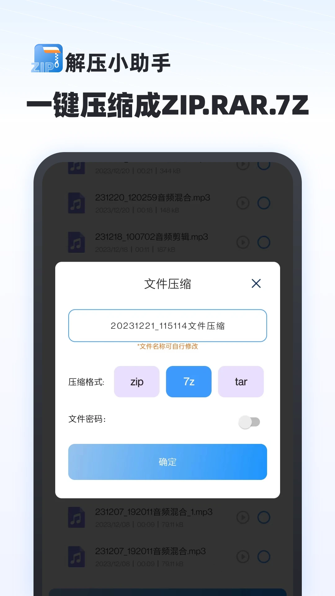 轻松将音频文件、图片、视频文件、文档、以及apk安装包进行压缩,压缩成zip、7z、tar格式;