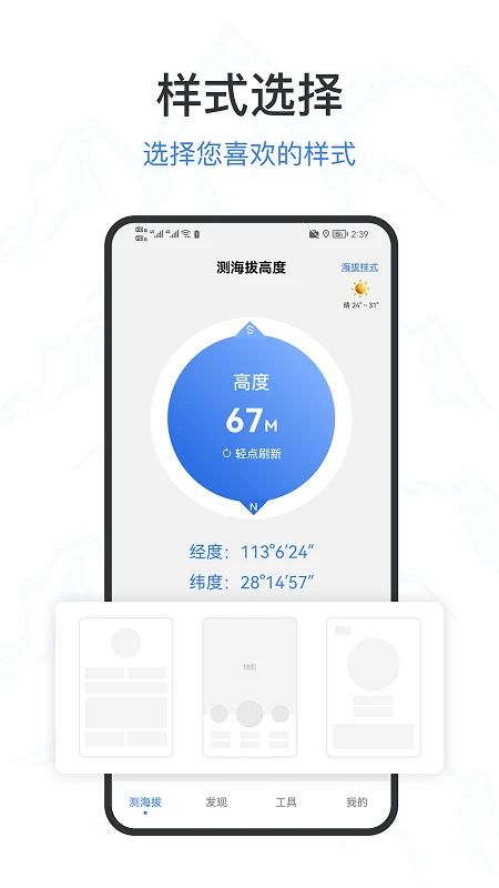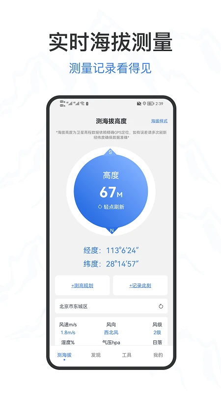 精准测量海拔高度,实时显示经纬度、天气、风速、风向、湿度等信息。简易版、地图版、极简版三种模式任意切换。