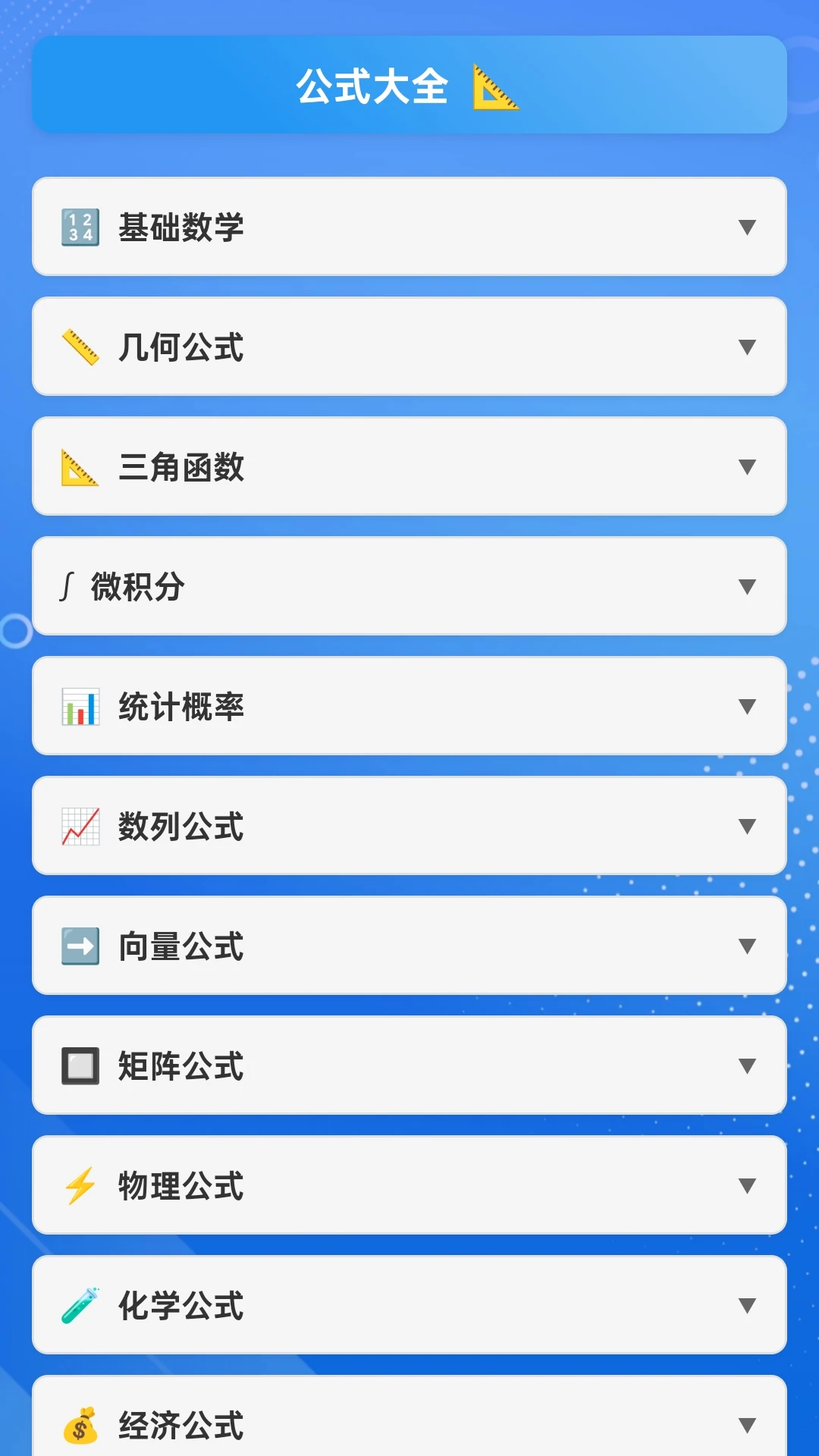 【公式大全】"公式大全"涵盖基础数学、物理、化学、经济等多个学科领域的公式。基础数学中又细分二次方程、勾股定理等多种公式,不仅列出公式内容,还对关键参数进行解释,方便用户随时查阅和理解,是学习和复习公式的实用工具。
