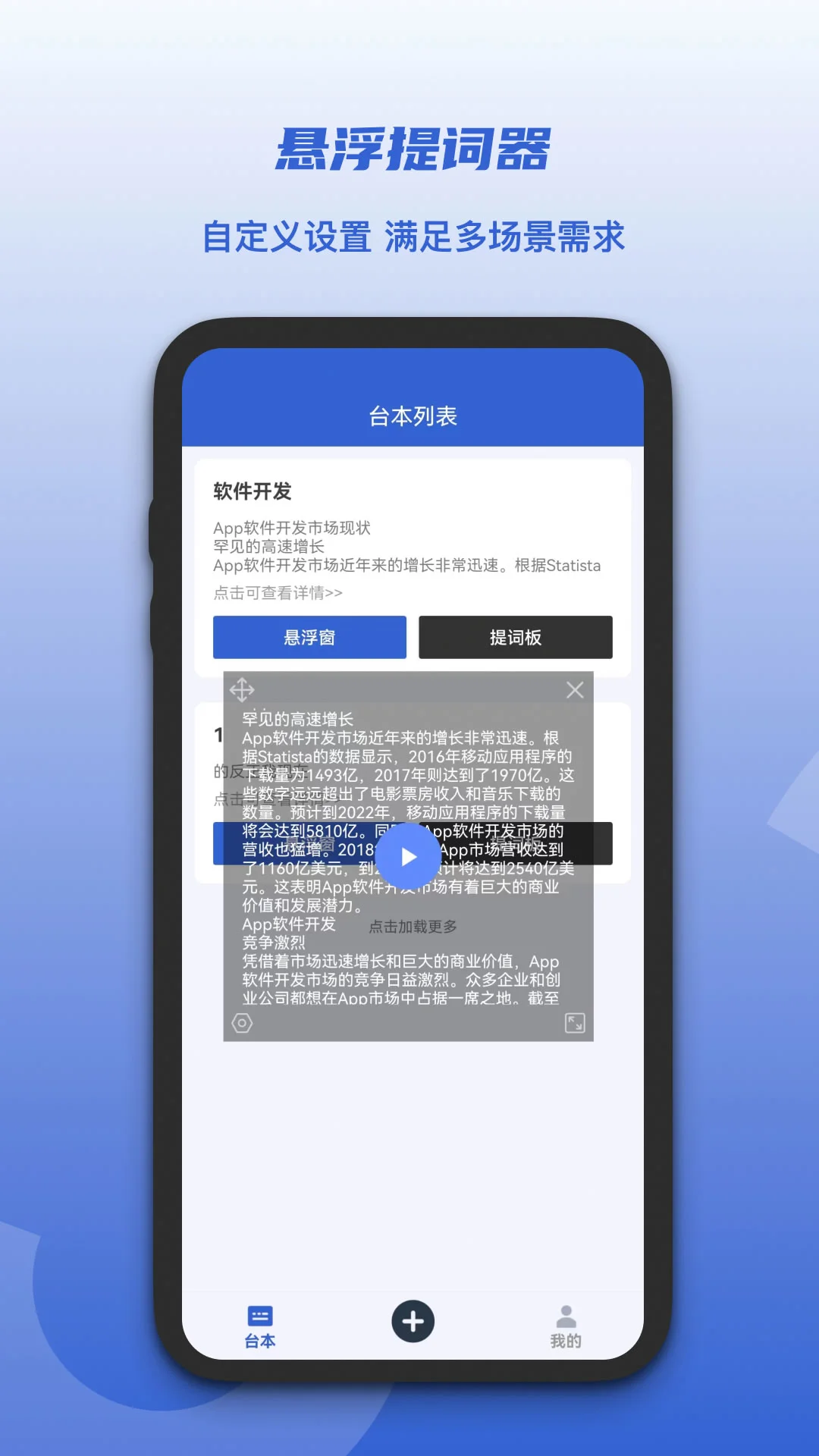 【悬浮提词器】支持任意直播和拍摄软件,并具有智能AI提词功能。台词可以跟随语速滚动,支持蓝牙遥控器控制悬浮窗台词,让用户双手解放,高效完成提词拍摄。它可以让用户告别多个手机提词,提高录制效率。