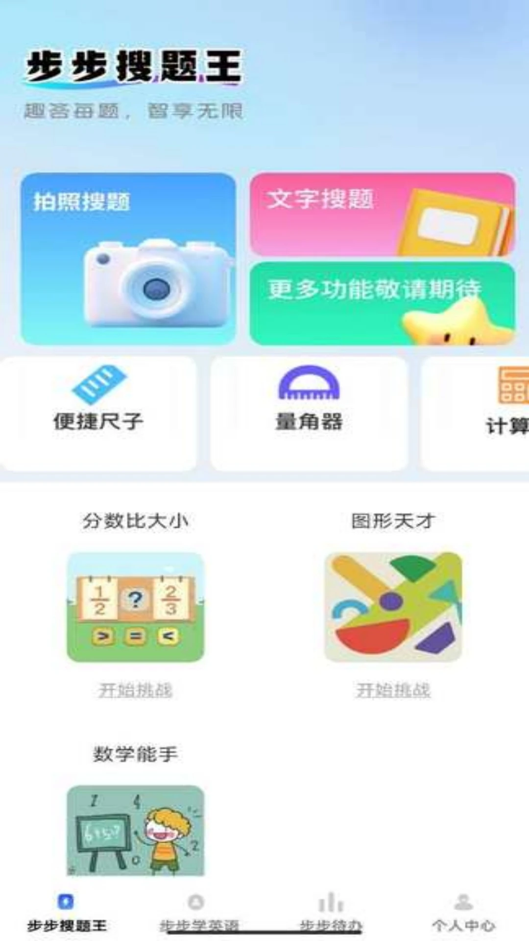 步步登科是一款为学习提供全面支持的智能工具,通过搜题小工具、英语学习和待办事项管理,让每一步学习过程都更加轻松高效,帮助用户不断提升学业成绩,步步登科。【步步搜题王】集成搜题小工具、量角器、刻度尺、计算器,助您轻松应对各类学习难题;【步步学英语】提供英语学习和四级词汇学习,提升您的语言能力;【步步待办】管理学习待办事项,让您的学习规划井然有序。