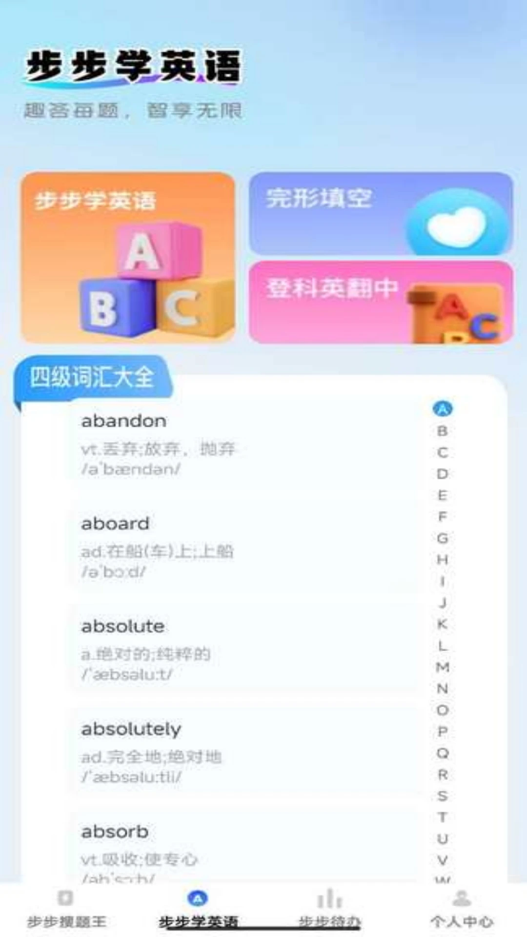 【步步学英语】提供四级高频词汇库,搭配例句与发音,助力词汇记忆与语境理解。